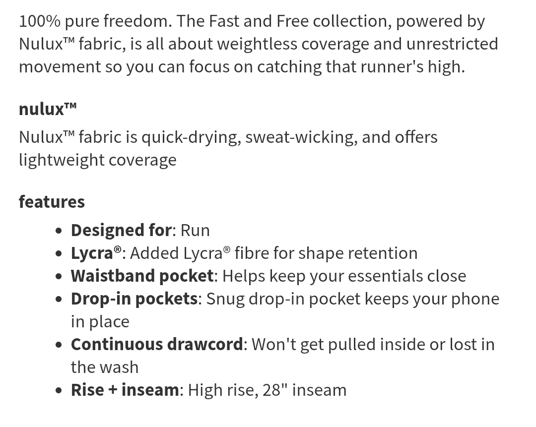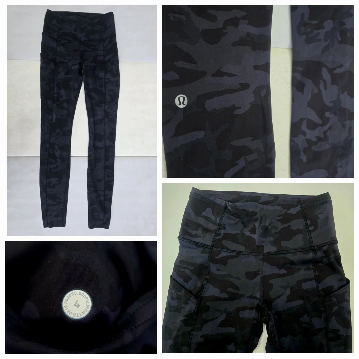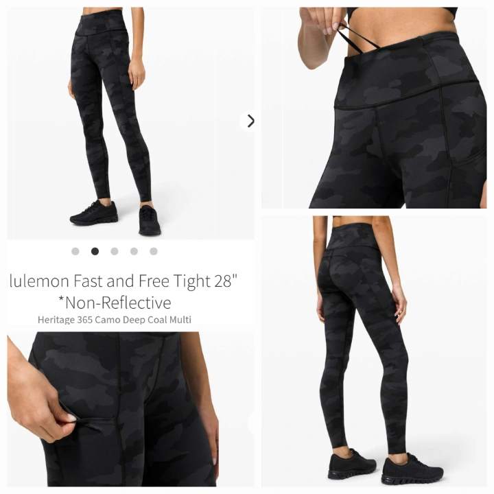 Lululemon Fast and Free Tight 28", size 4. Non-reflective. Heritage 365 Camo Deep Coal Multi colour. Features include a high rise, 28" inseam, waistband pocket, and drop-in pockets. Nulux™ fabric for lightweight coverage, quick-drying, and sweat-wicking. Excellent for running.