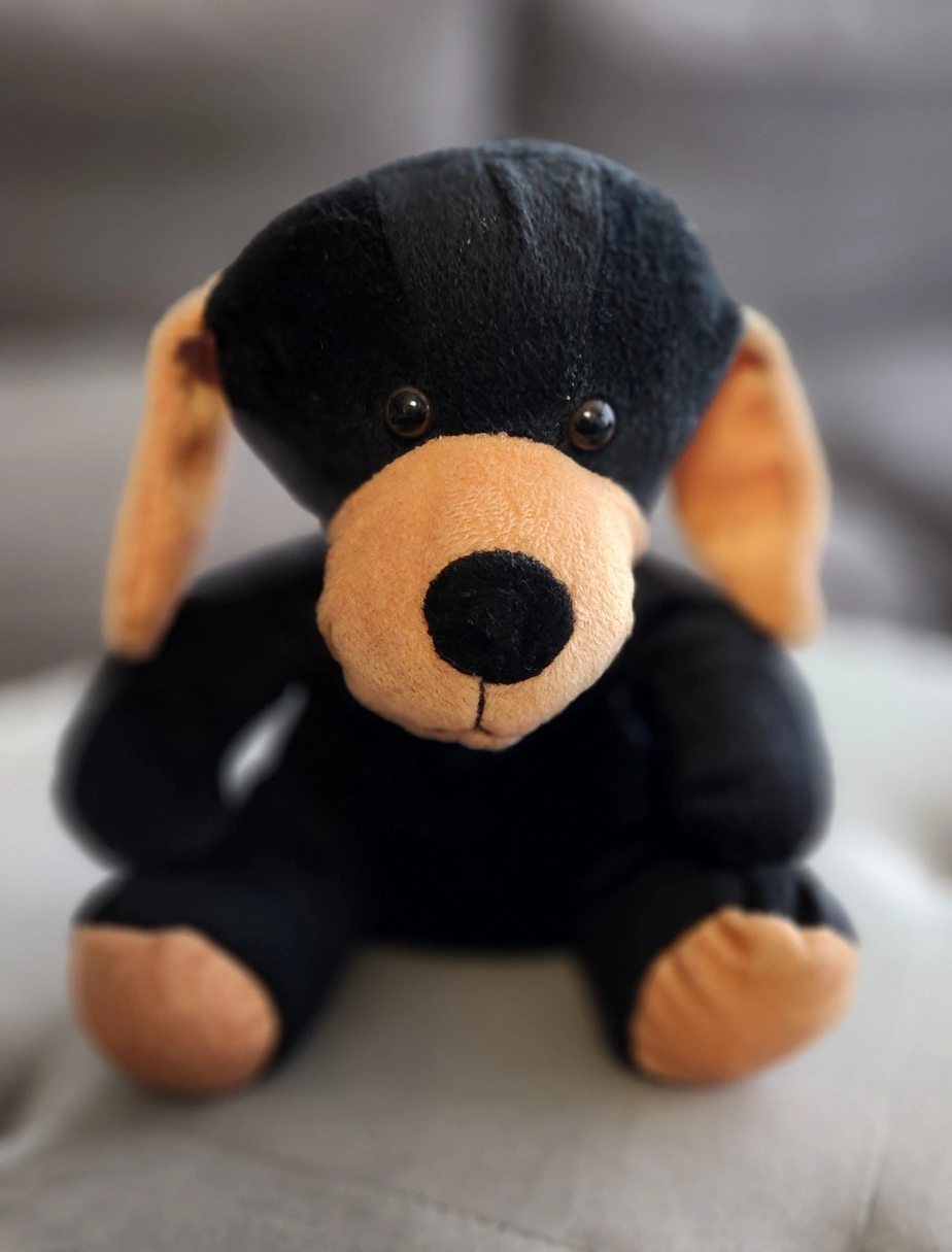 Small plush puppy, black with tan ears. Soft and cuddly. Perfect for children or collectors. Never been used but tags have been removed. Measures approx. 9" tall, 6" wide and 8" long.