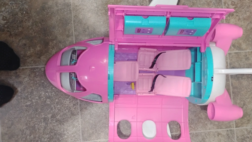 Pink airplane playset. Features opening compartments and seats. Great for imaginative play. Great used condition.