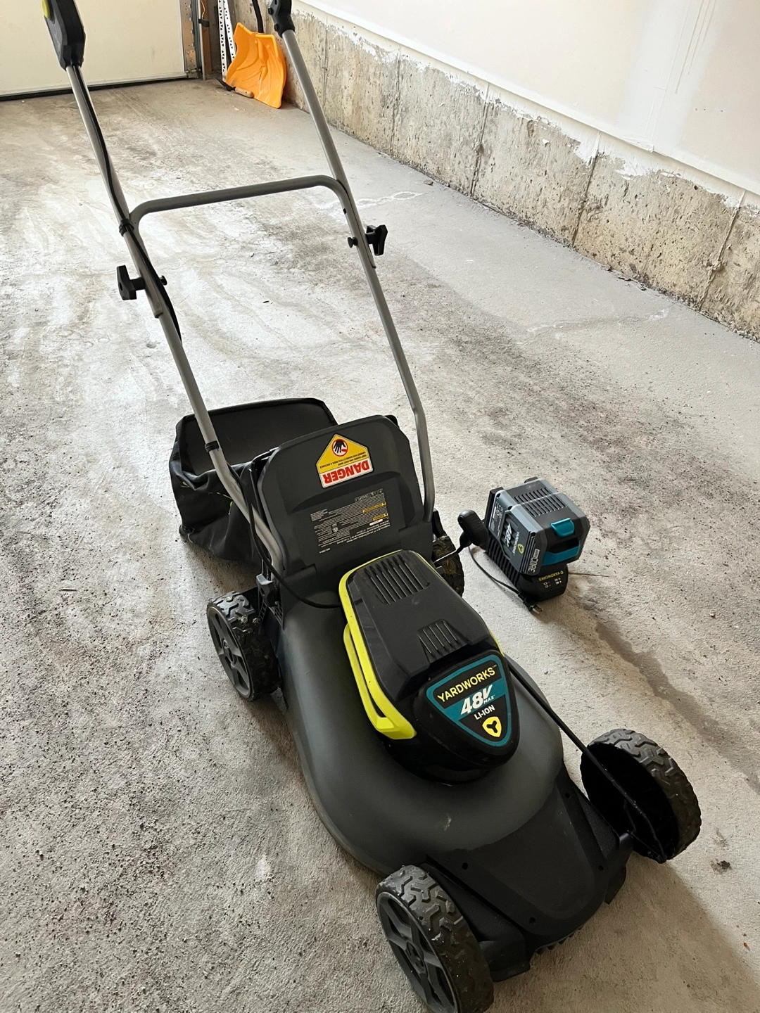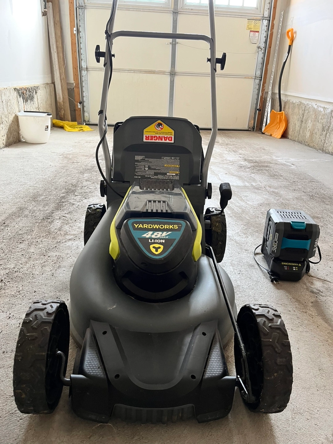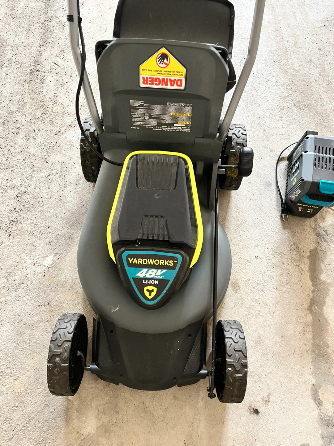 Yardworks 48V cordless lawnmower. Includes battery and charger. Grey and yellow colour scheme.