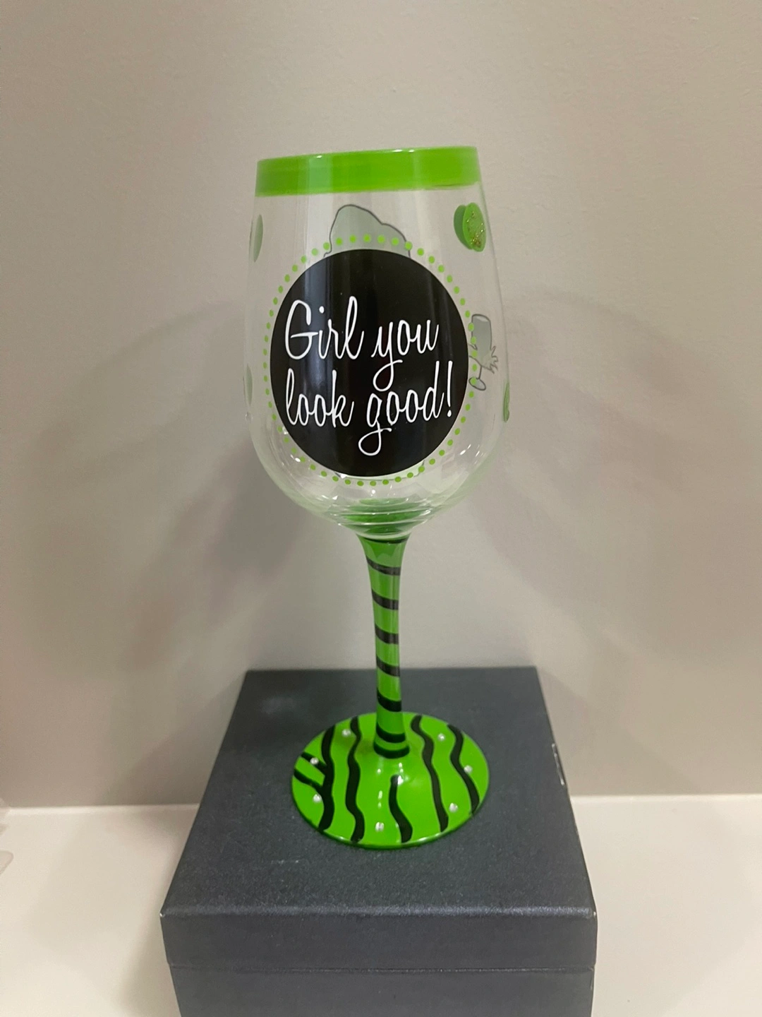 ***JUST REDUCED TO 9.00***Unique wine glass. Features a hand-painted design. Lime green accents and black stripes. Says "Girl you look good!"