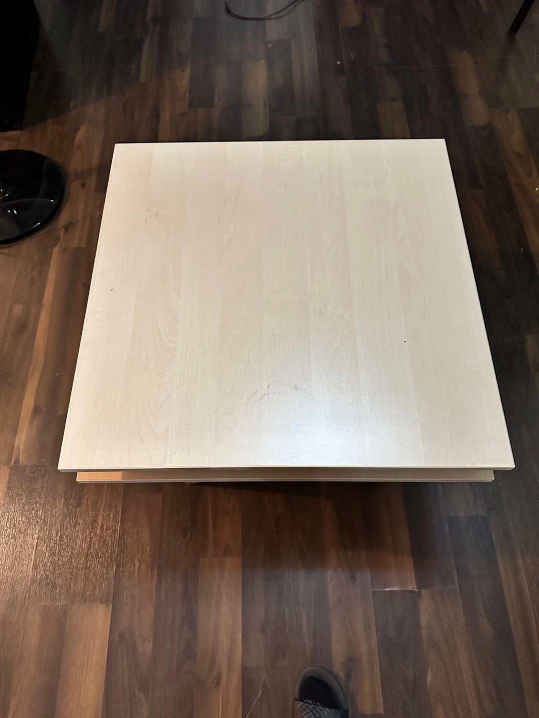 Light beige Coffee Table bought from Walmart six months ago. In very good condition. Features a lower shelf. Wooden legs. Good for small spaces. No dents or markings. Pet free and smoke free home. Offer negotiable.