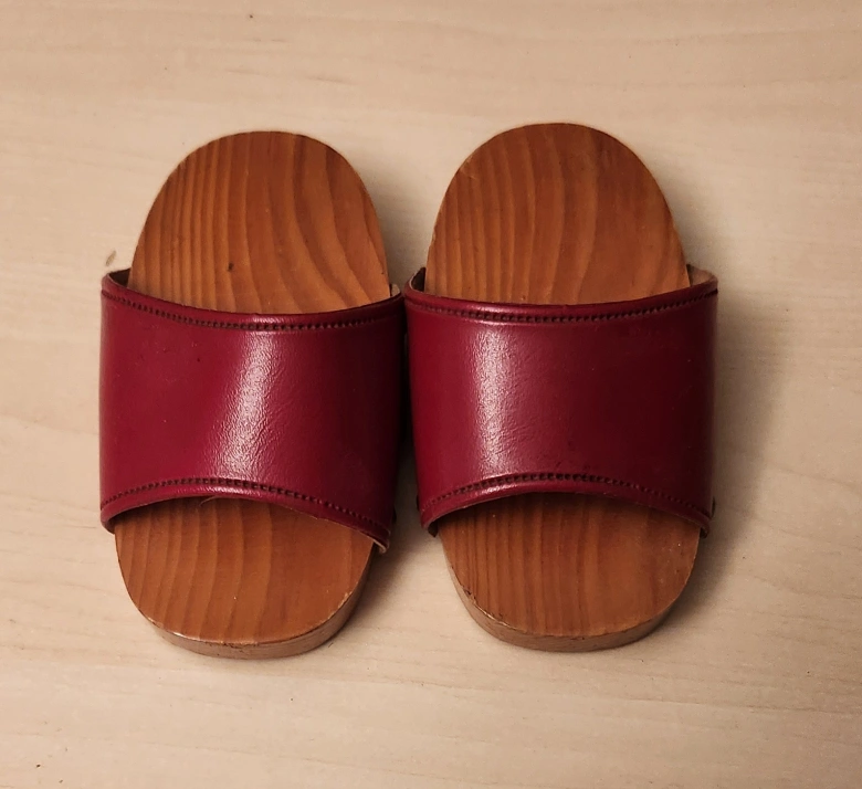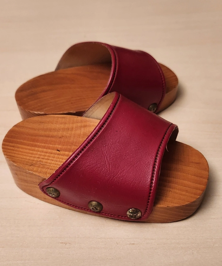 354Pair of vintage geta sandals. Wooden base, burgundy leather straps. Small, likely for a child or doll. Unique design, decorative studs.