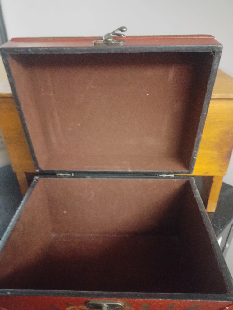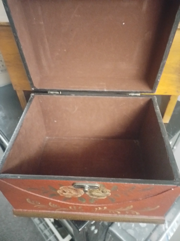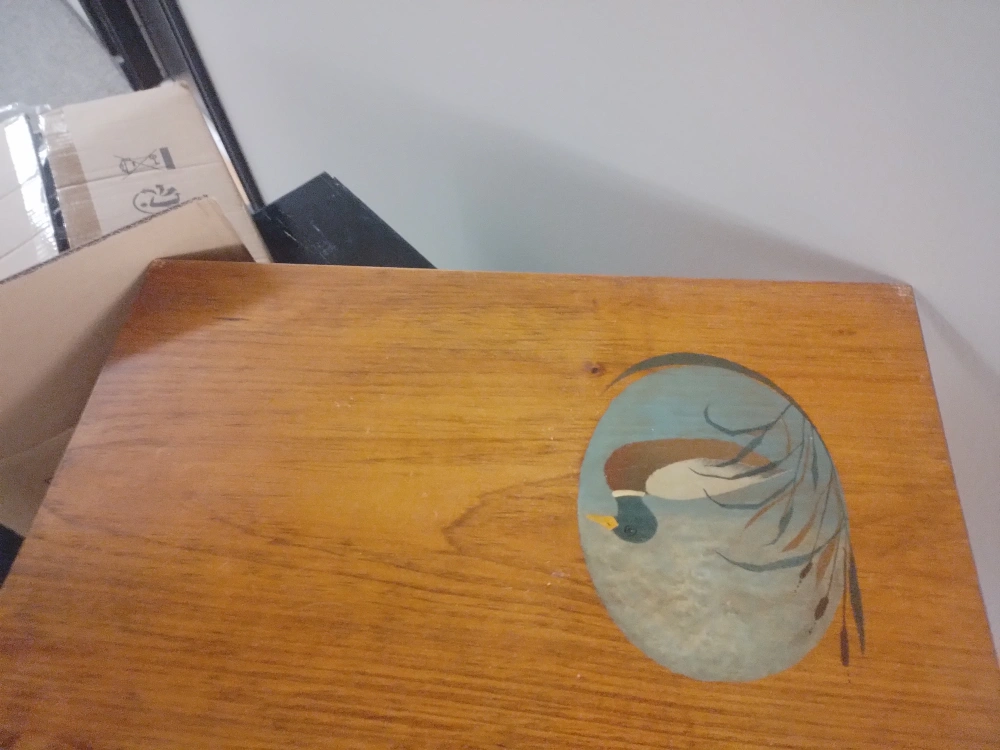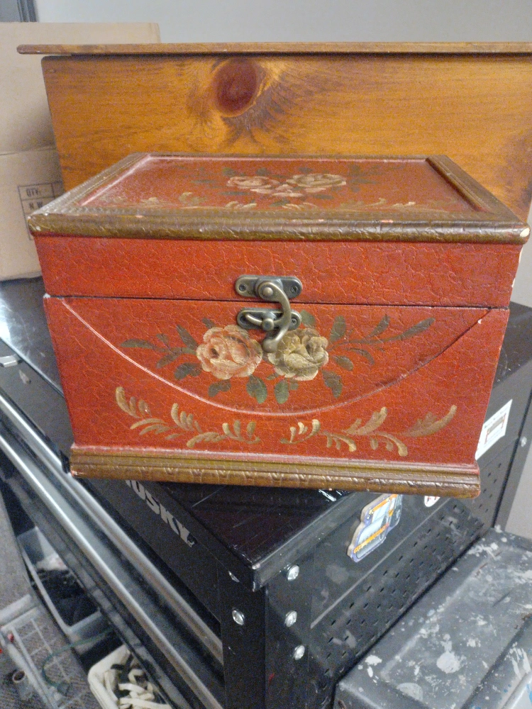 43Set of two vintage wooden boxes. One features a painted duck design, the other has hand-painted roses. Both have hinged lids and are ideal for storage or display. Show some character and minor wear.