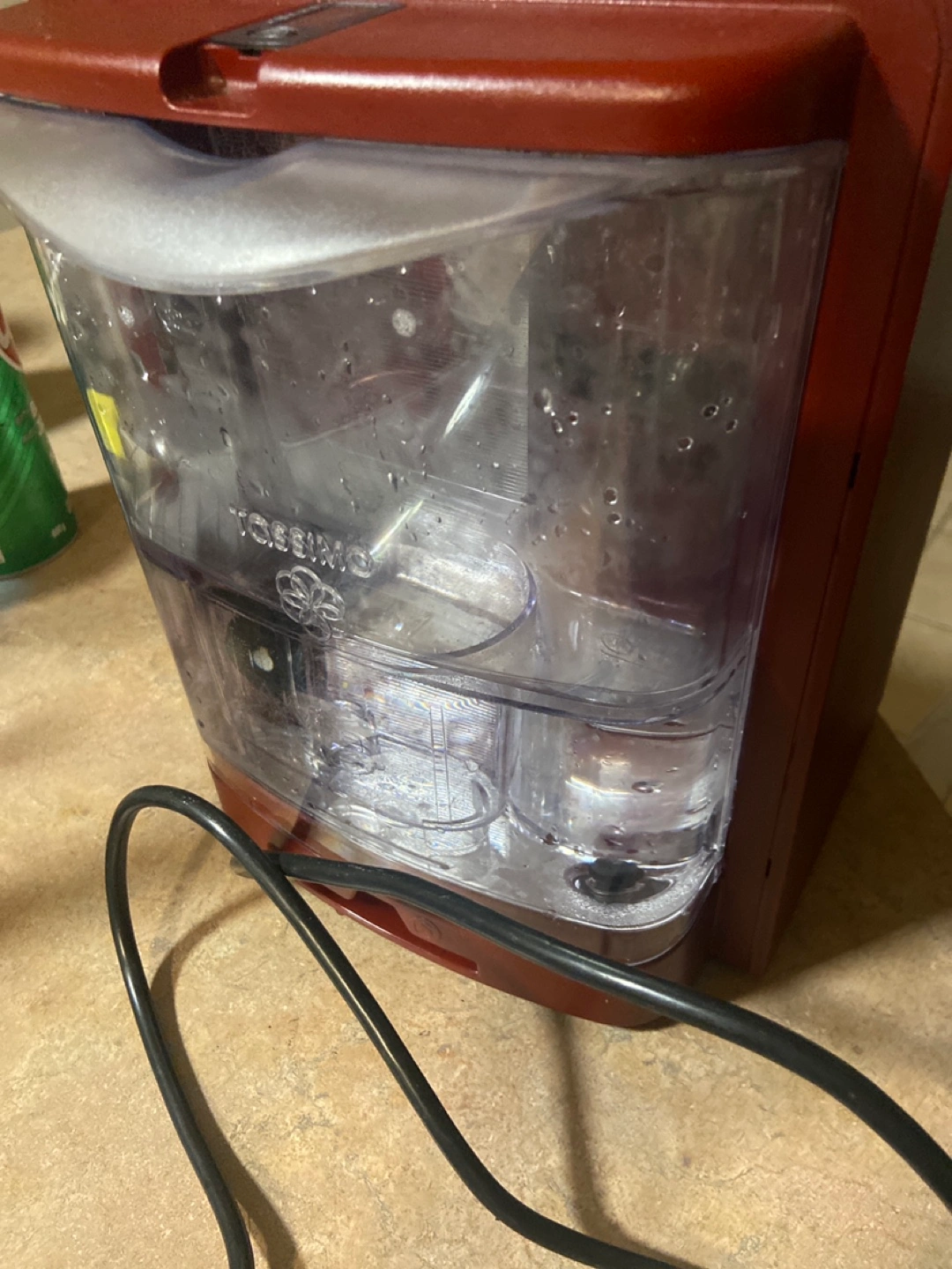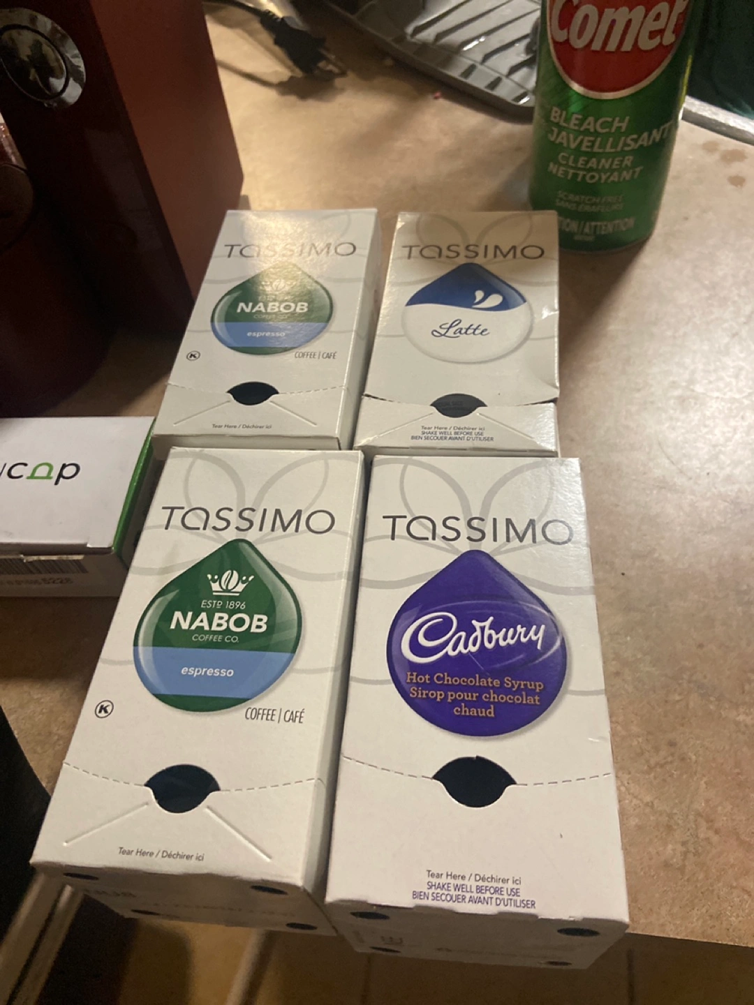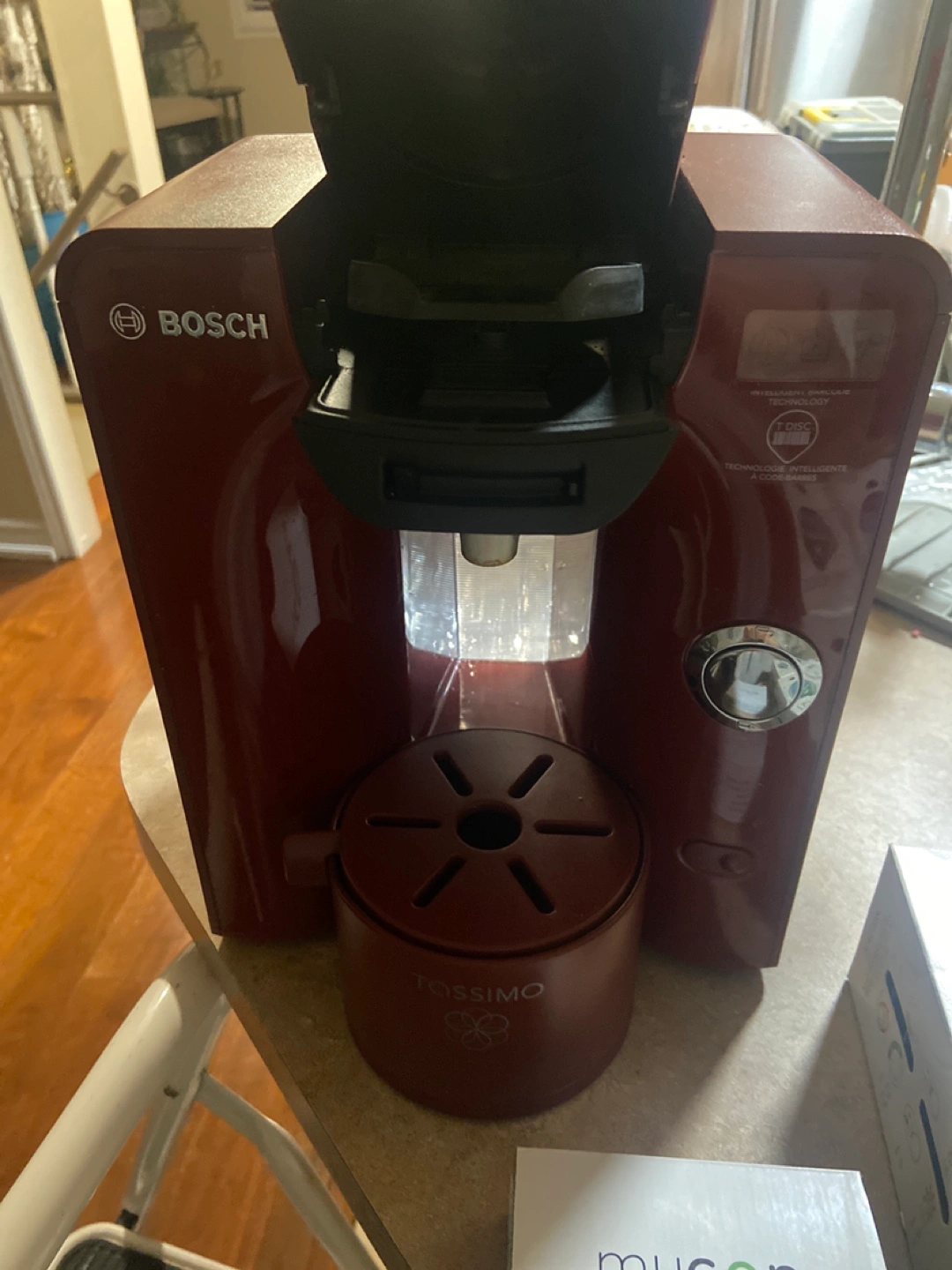 Red Bosch Tassimo coffee maker. Includes various Tassimo pods. All for $40