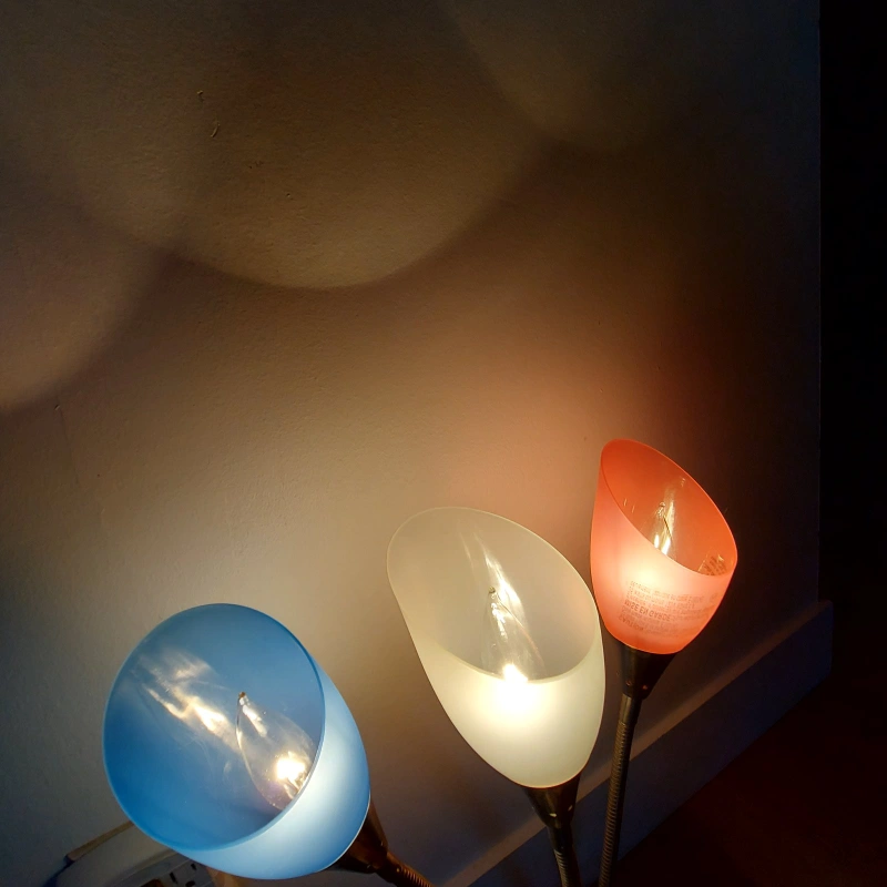 Three-way flexible lamp. Features pink, white, and blue frosted glass shades. Silver metal base and stems. Plugs into standard wall outlet.