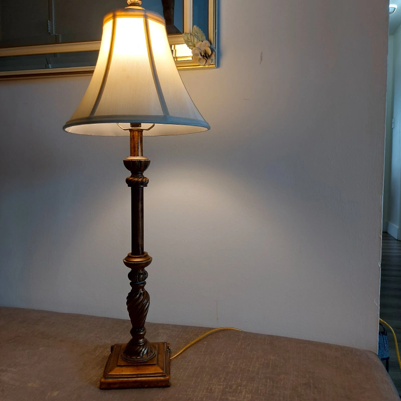 Beautiful table lamp. Features a turned wooden base and a classic off-white shade with a subtle blue trim. Perfect for a bedside table or living room. Adds a touch of sophistication to any space.