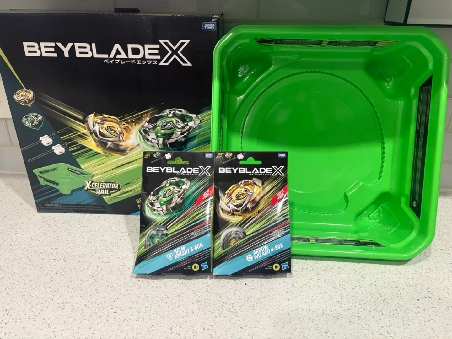 New Beyblade X bundle pack. Includes two Beyblades: Helm Knight 3-80N and Arrow Wizard 4-80B. Also includes a green Beystadium. Great for battling!