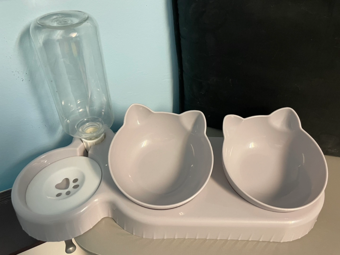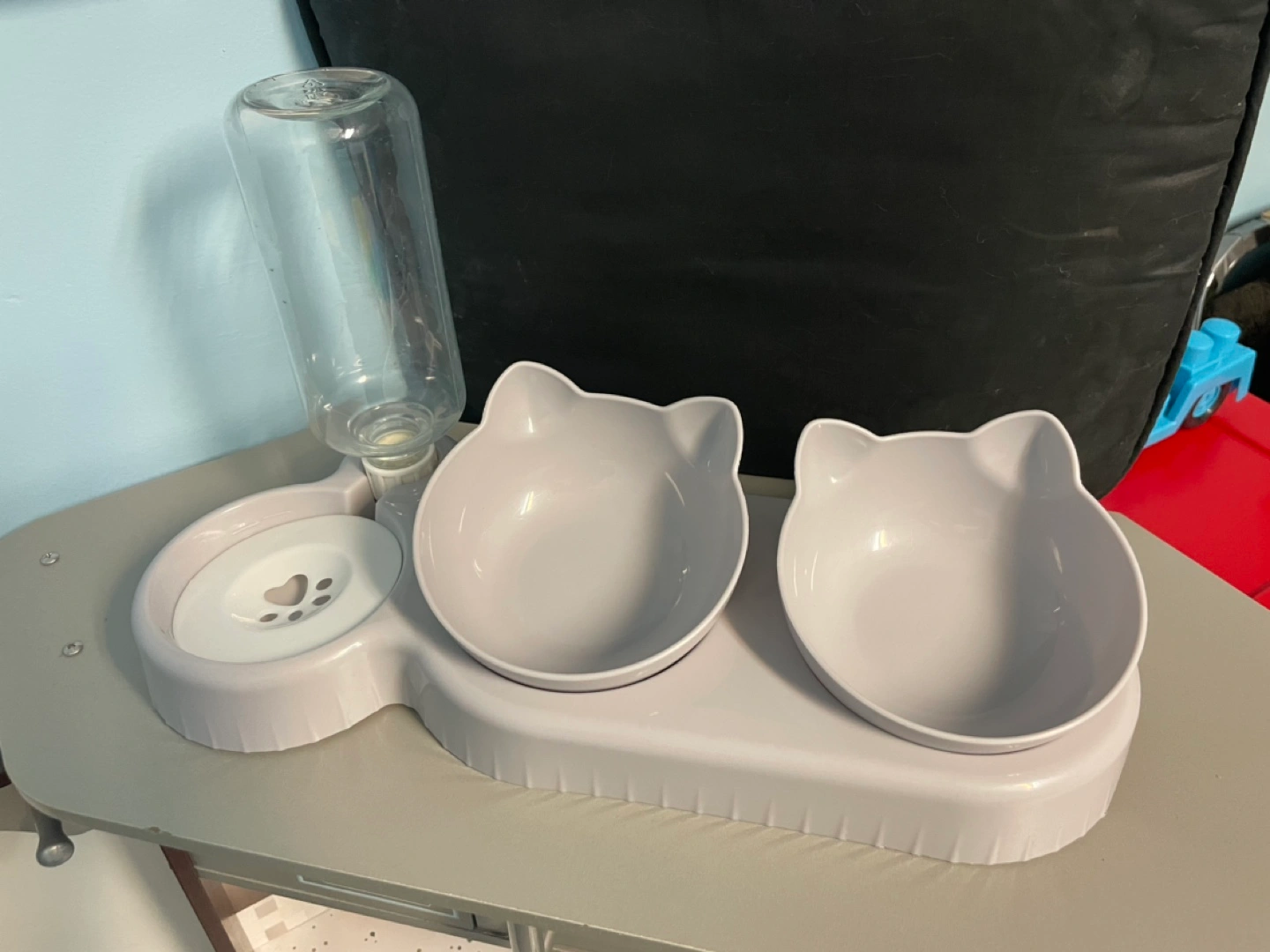 Adorable cat bowl set. Two bowls, water dispenser, and a paw-shaped water tray. Lightweight plastic. Grey colour.