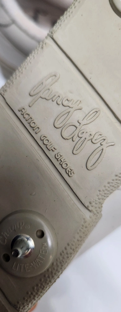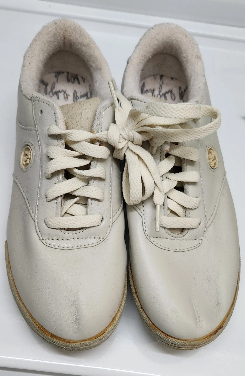 349Pair of vintage women's golf shoes. Light beige leather. Lace-up closure. Removable spikes. Good condition.