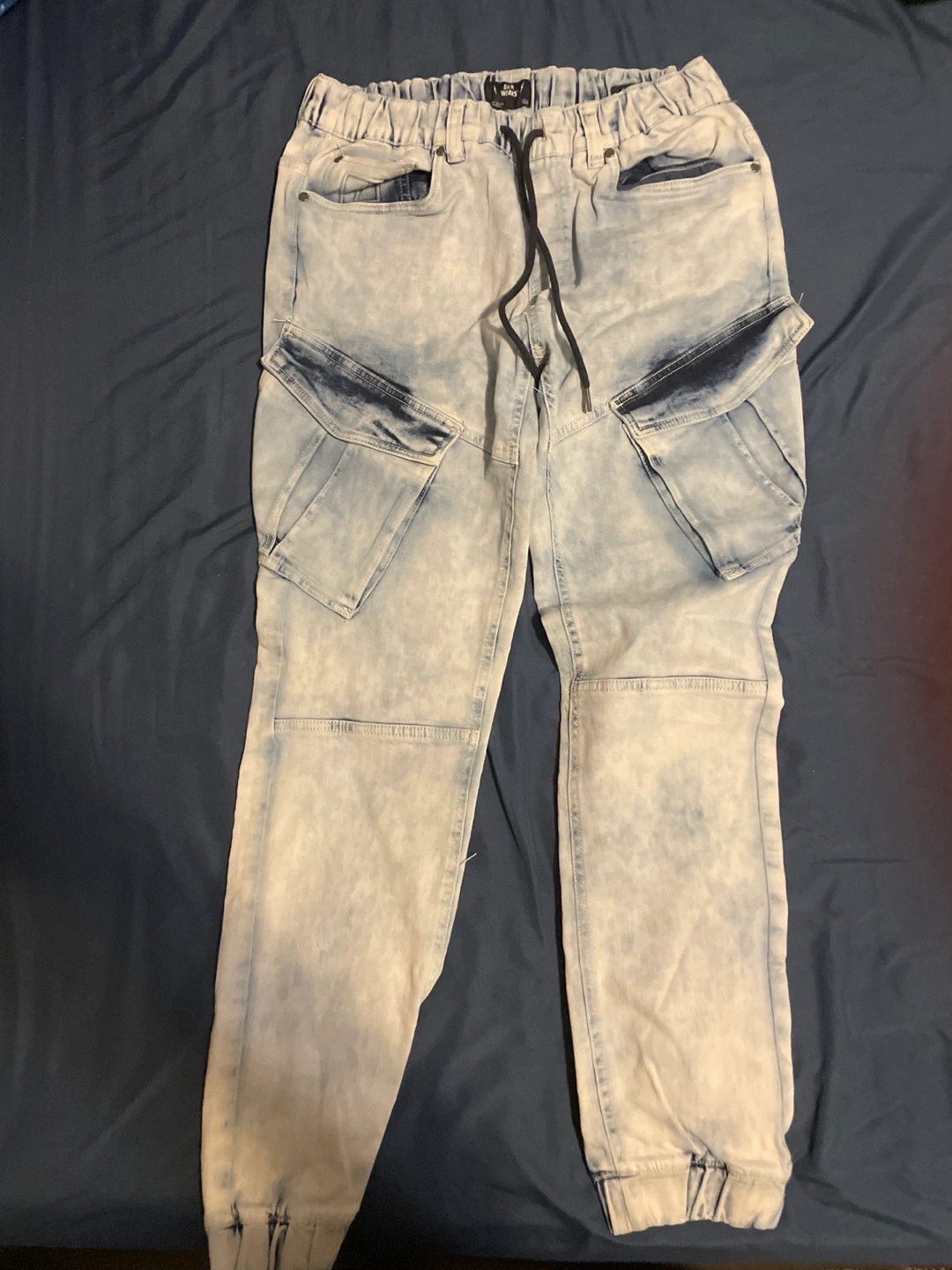 Men's light blue acid wash denim cargo joggers. Drawstring waistband. Multiple pockets.
