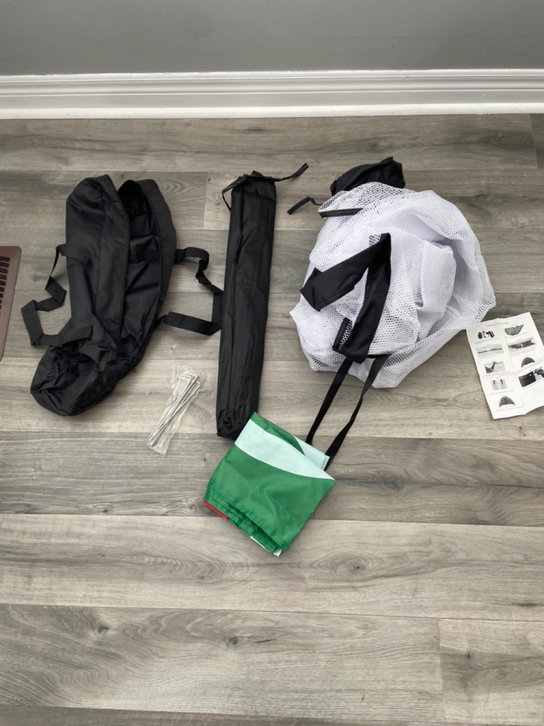 Pop-up style practice cage. Includes target for chipping accuracy. Durable polyester netting. Easy assembly and disassembly. Two shock-corded fibreglass poles with anchoring pins. Great for practicing your golf game.