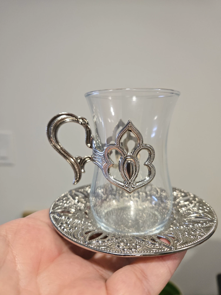 Six elegant Turkish tea glasses. Each glass features a silver-tone metal handle and coaster. Intricate detailing. Perfect for serving tea or coffee.