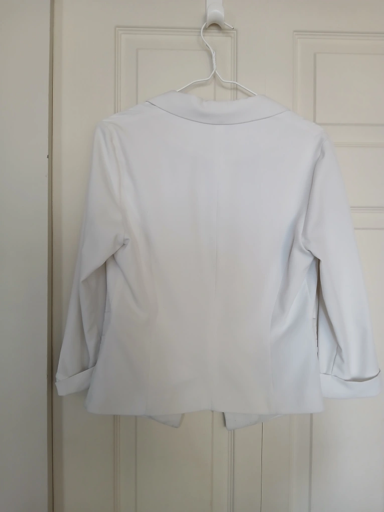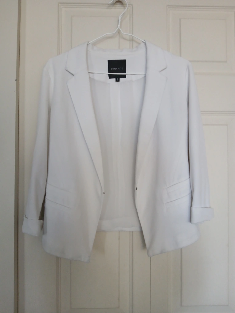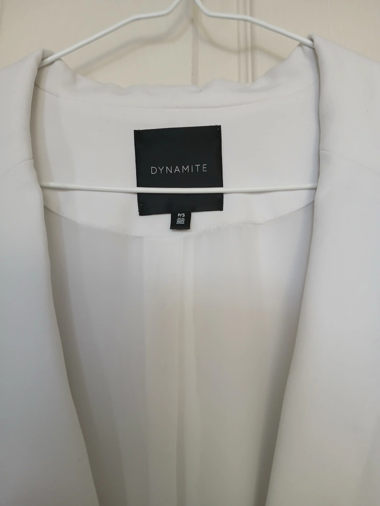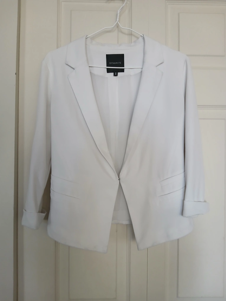 Type: Blazer with little latch to close. Elevate your style with this elegant white cream blazer from Dynamite. Perfect for any occasion (formal for work / office and informal in a cute outfit with jeans), this jacket adds a touch of sophistication to your wardrobe and matches with any outfit!