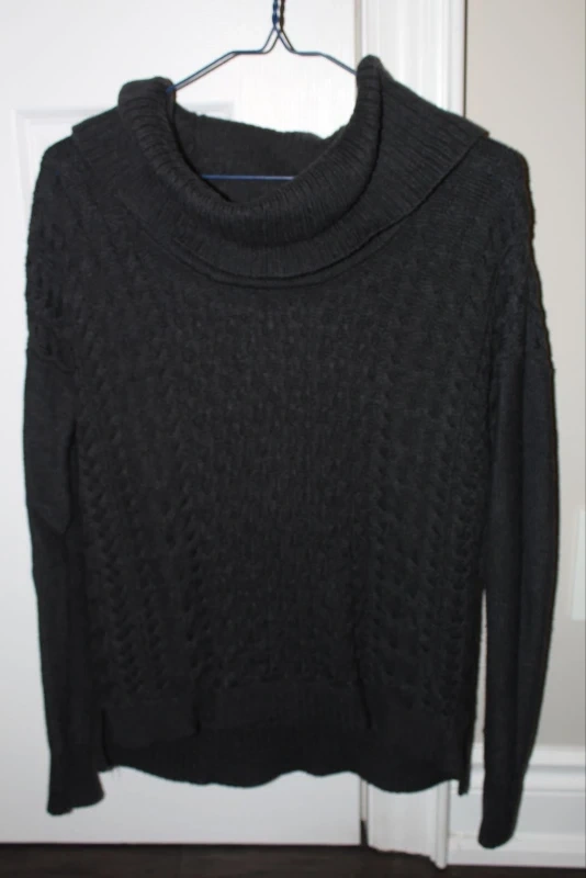 Women's dark grey cowl neck sweater. Small size. Long sleeves. Cable knit pattern. Made in China.