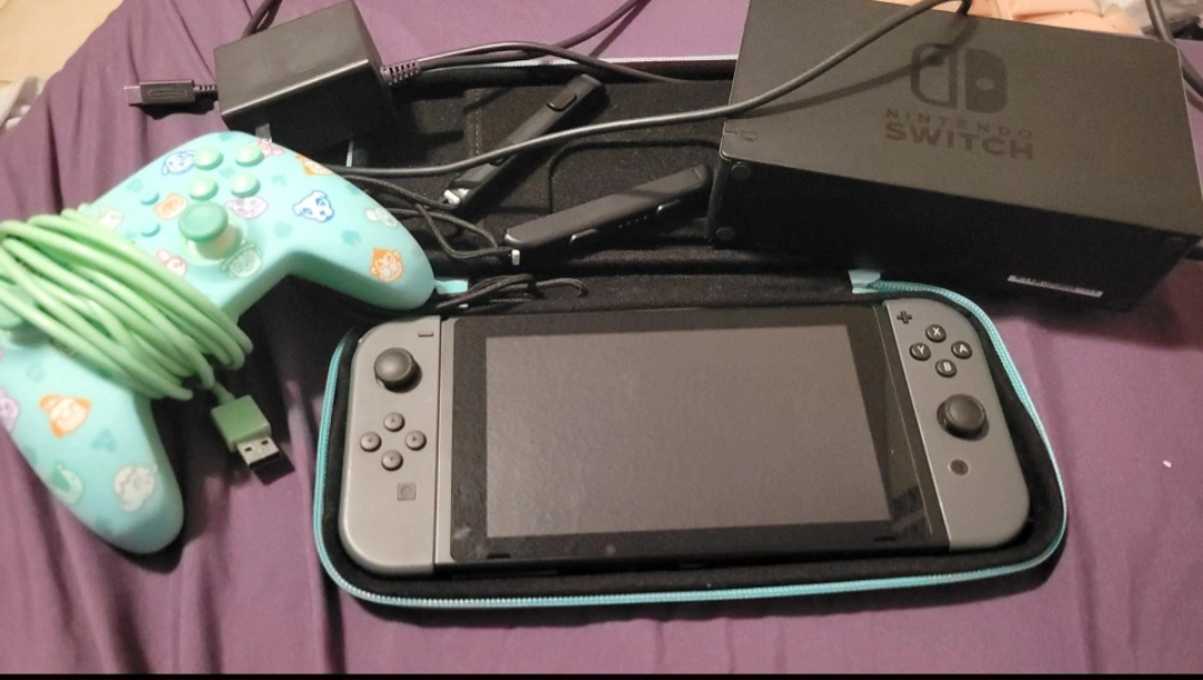 Nintendo Switch console, carrying case, power adapter, joy-con controllers, and additional controller. Everything shown in images included.