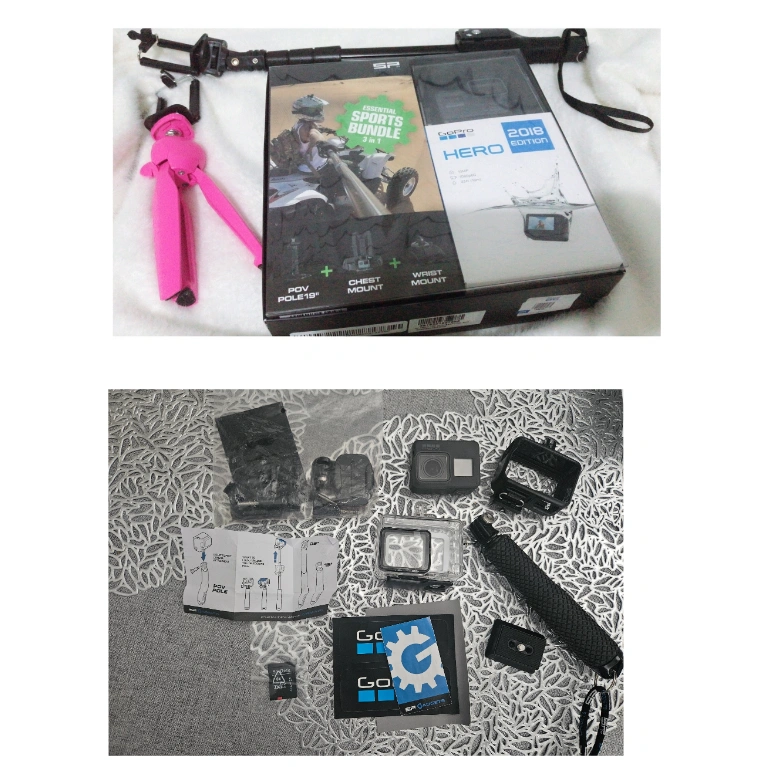 GoPro Hero 2018 Edition action camera. Includes POV pole, chest mount, wrist mount, additional accessories, and SD card. Pink mini tripod not included.