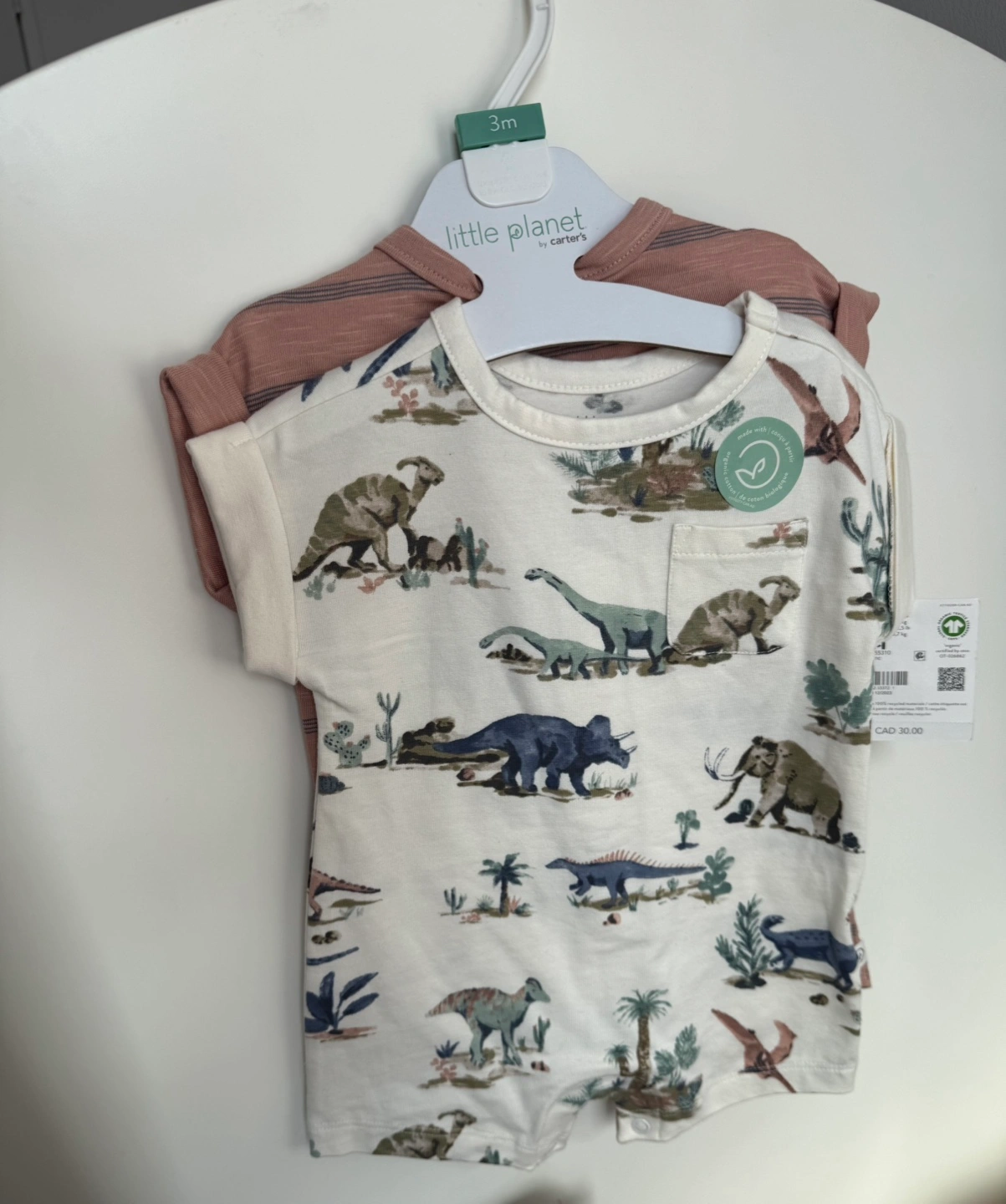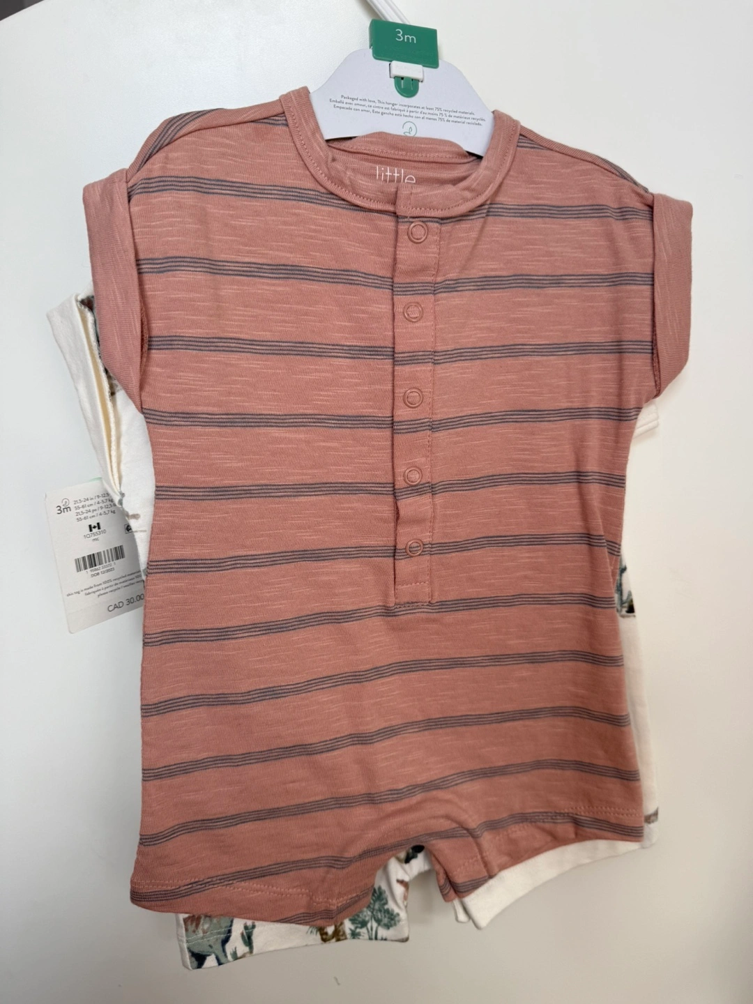 Adorable 2-piece outfit. Size 3 months. Features a mauve striped romper and a dinosaur print romper. Brand new with tags.