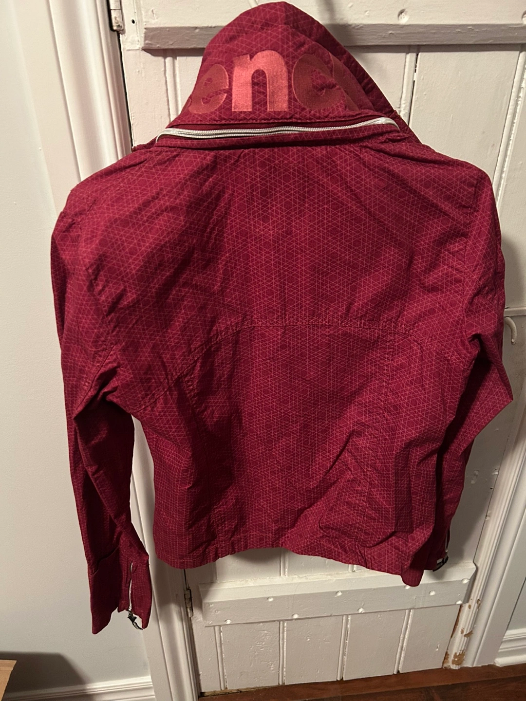 Burgundy patterned lightweight jacket. Size medium. Features a zip-up front, two zippered pockets, and a stand-up collar.
