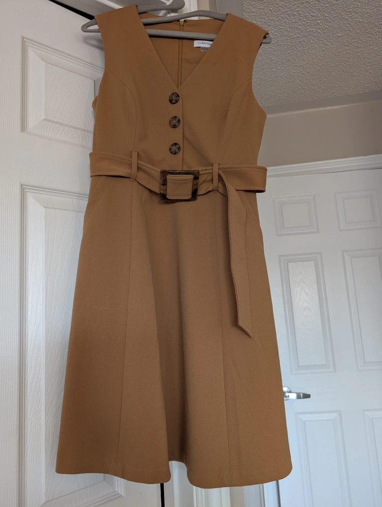 A-line sleeveless dress. Camel colour. Features a v-neck, button front, and self-tie belt. Looks great for work or a casual outing.