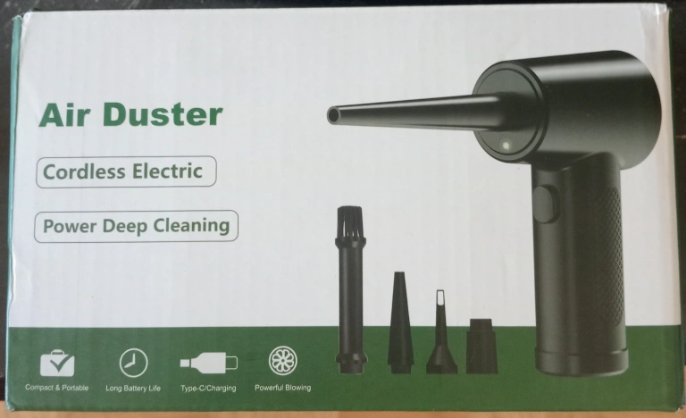 Powerful air duster. Cordless and electric. Includes multiple attachments. Compact and portable. Long battery life. Type-C charging.
