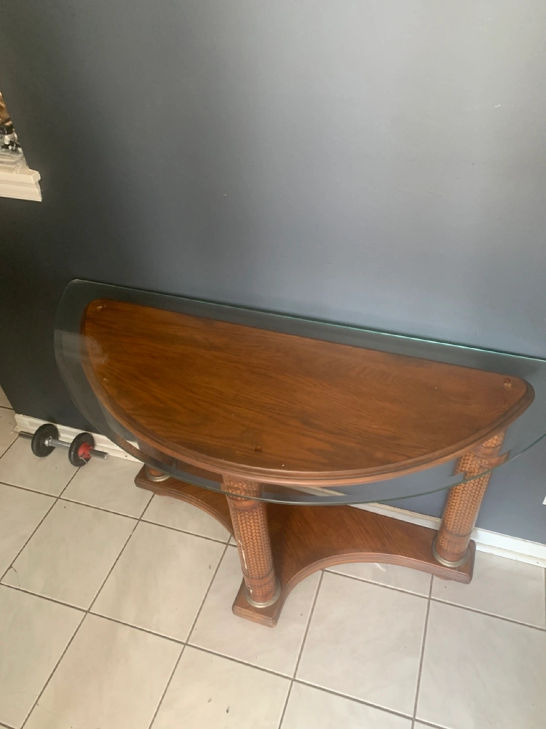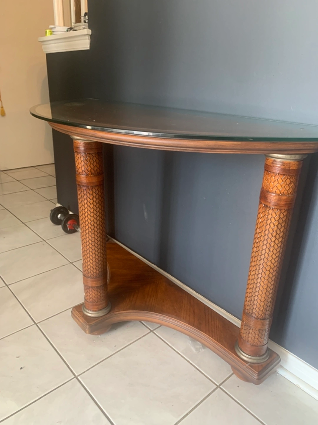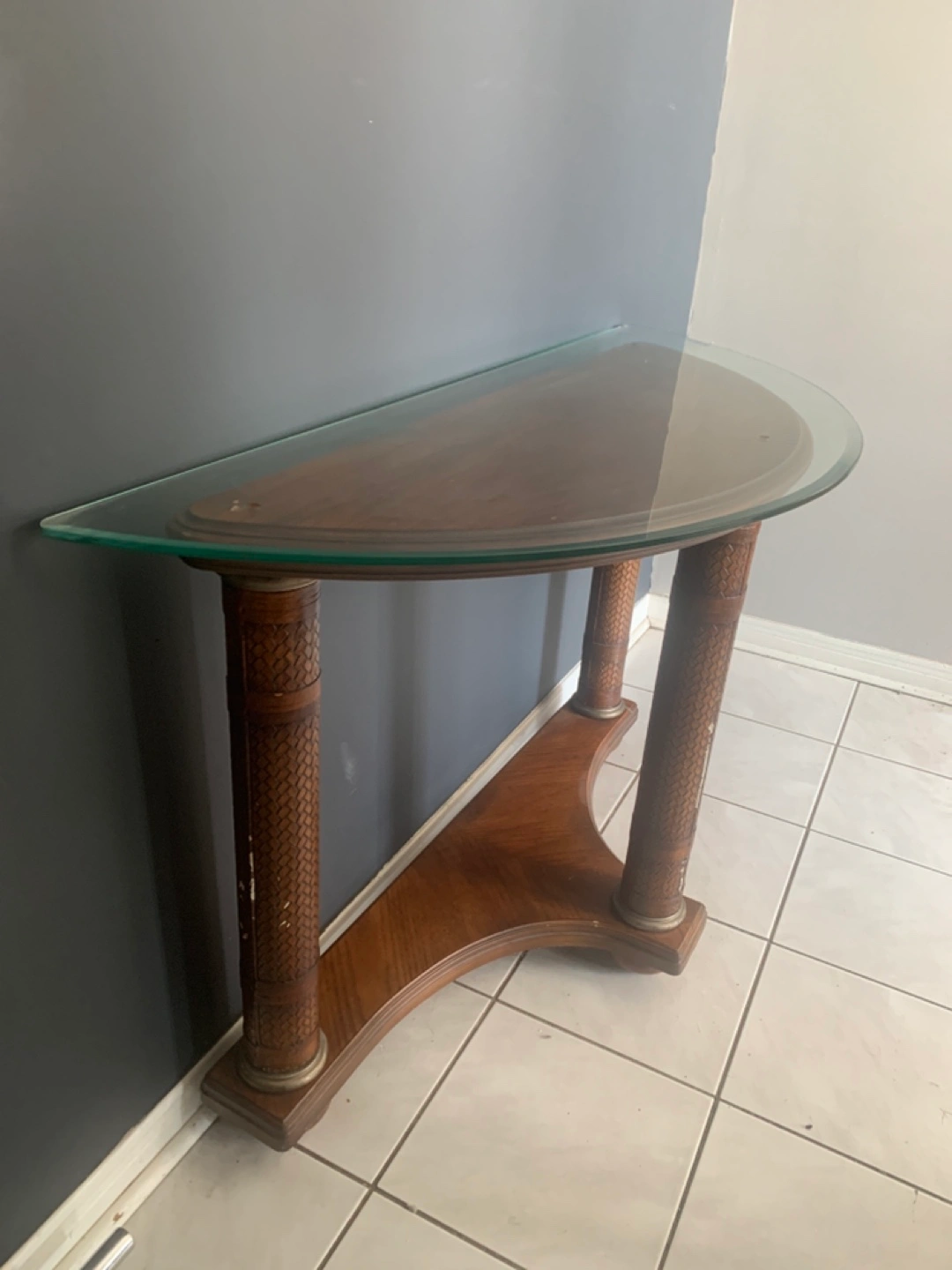 Elegant half-round console table. Features a glass top and decorative columns. Solid wood construction. Perfect for an entryway or hallway.