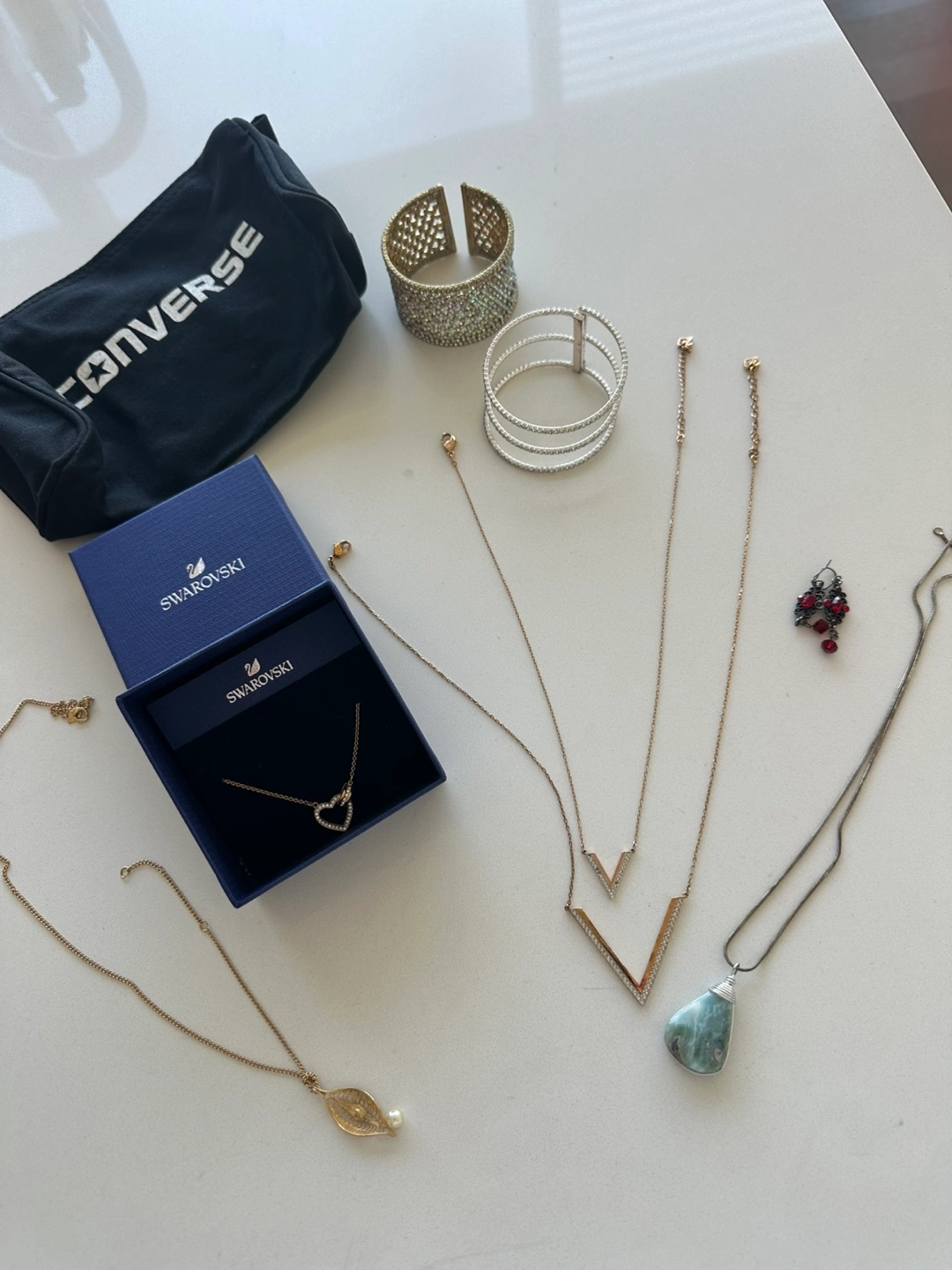 Assortment of necklaces, bracelets, and earrings. Includes a Swarovski heart necklace and two crystal bracelets. Various styles and materials. Great for layering or individual use.