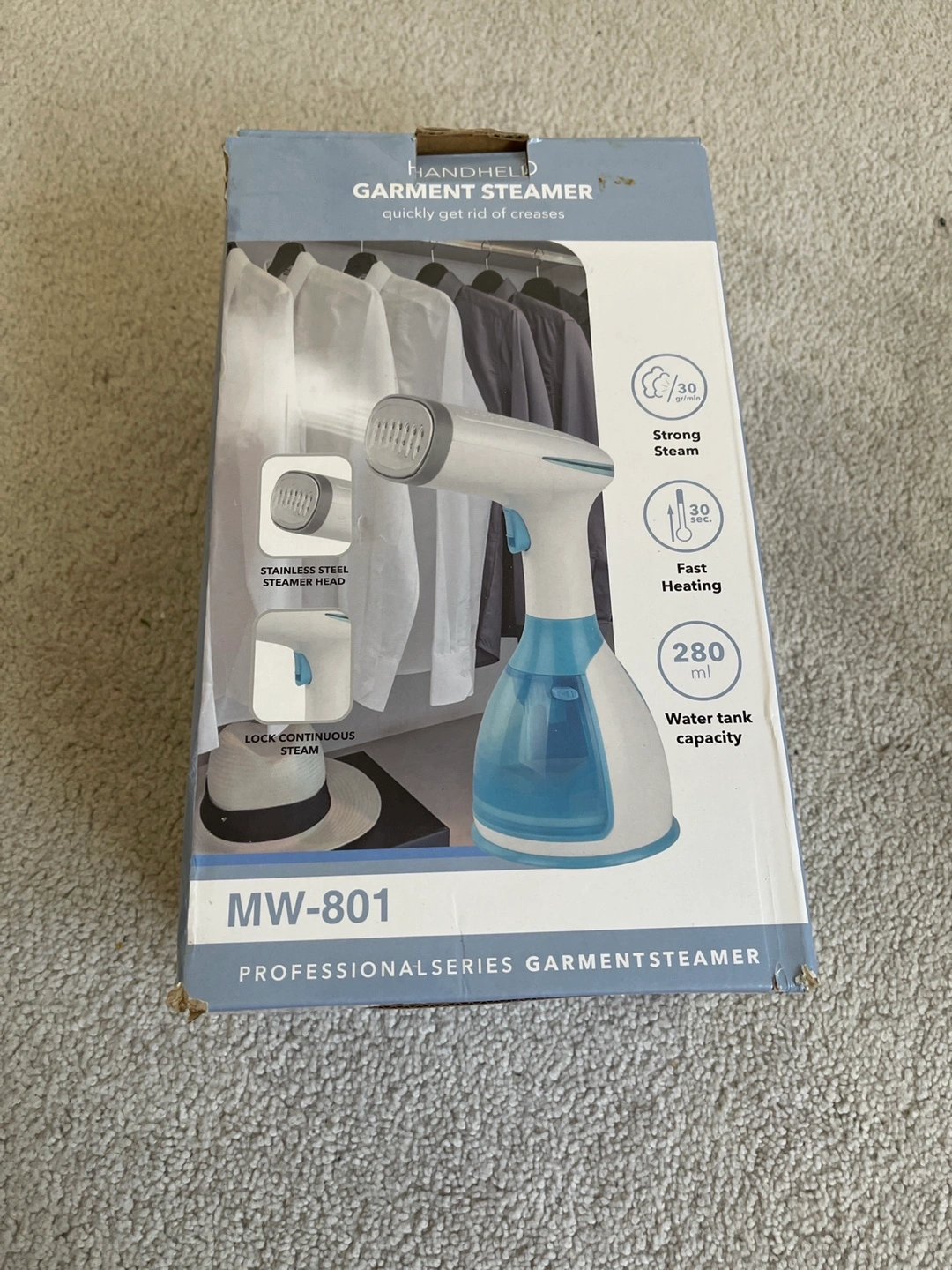 Handheld garment steamer. Quickly removes creases. Features strong steam, fast heating, and a large water tank capacity. Stainless steel steamer head. Lock continuous steam function.