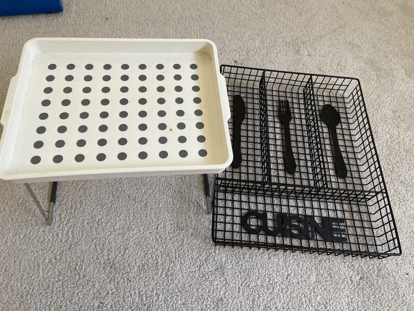 Foldable tray with grey polka dots. Black wire cutlery organizer with Cuisine label. Great for kitchen organization.