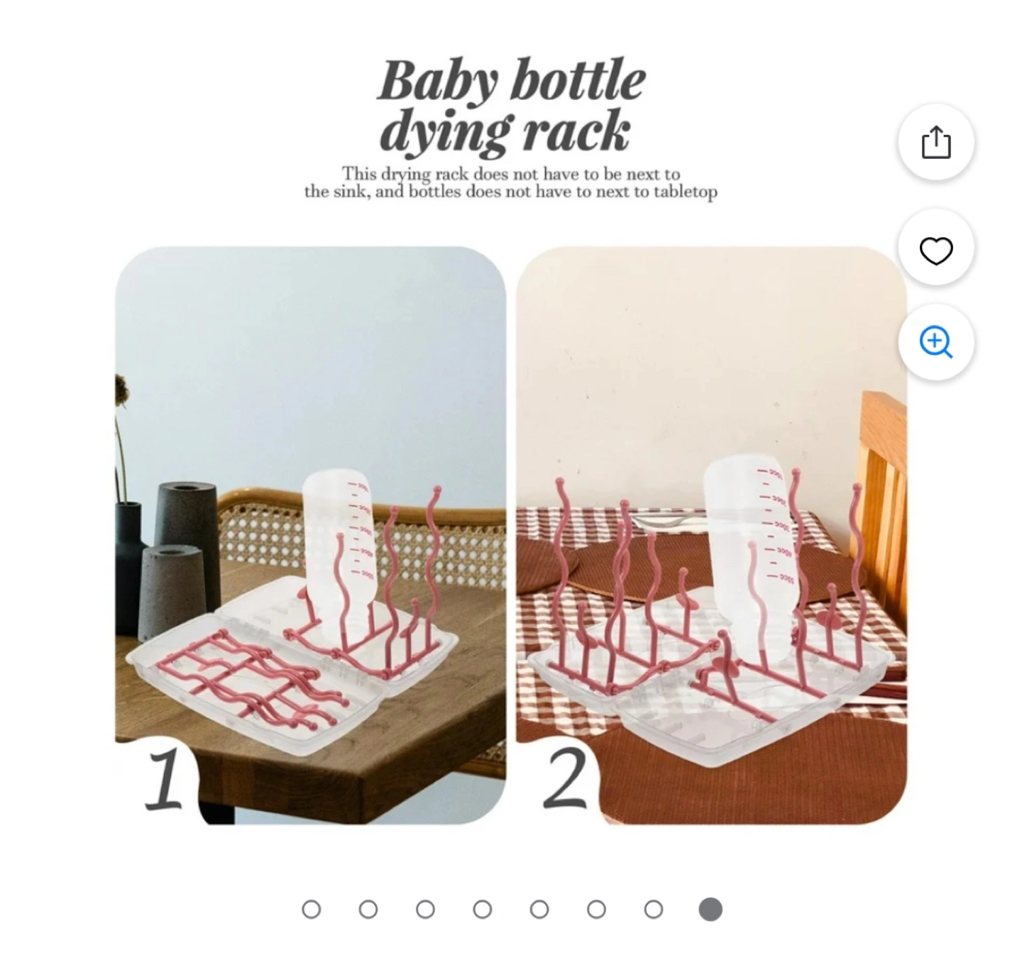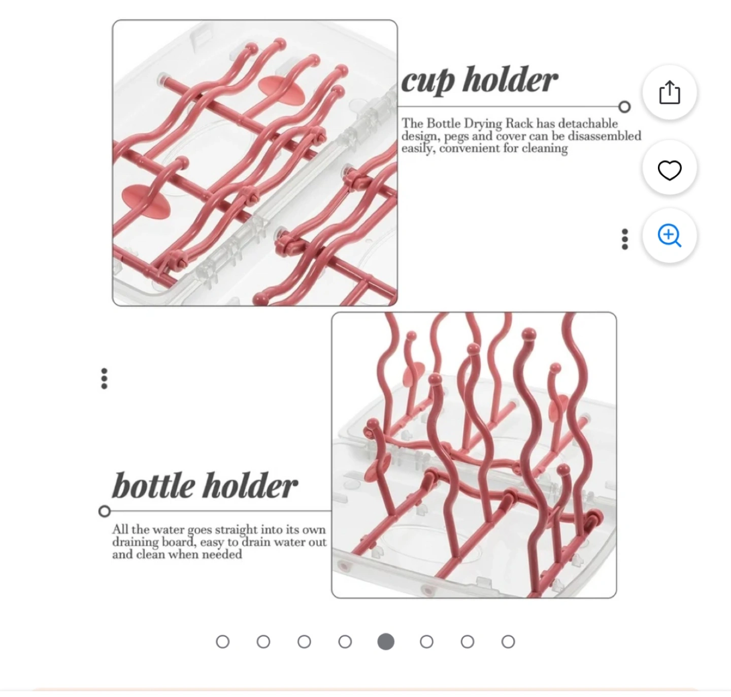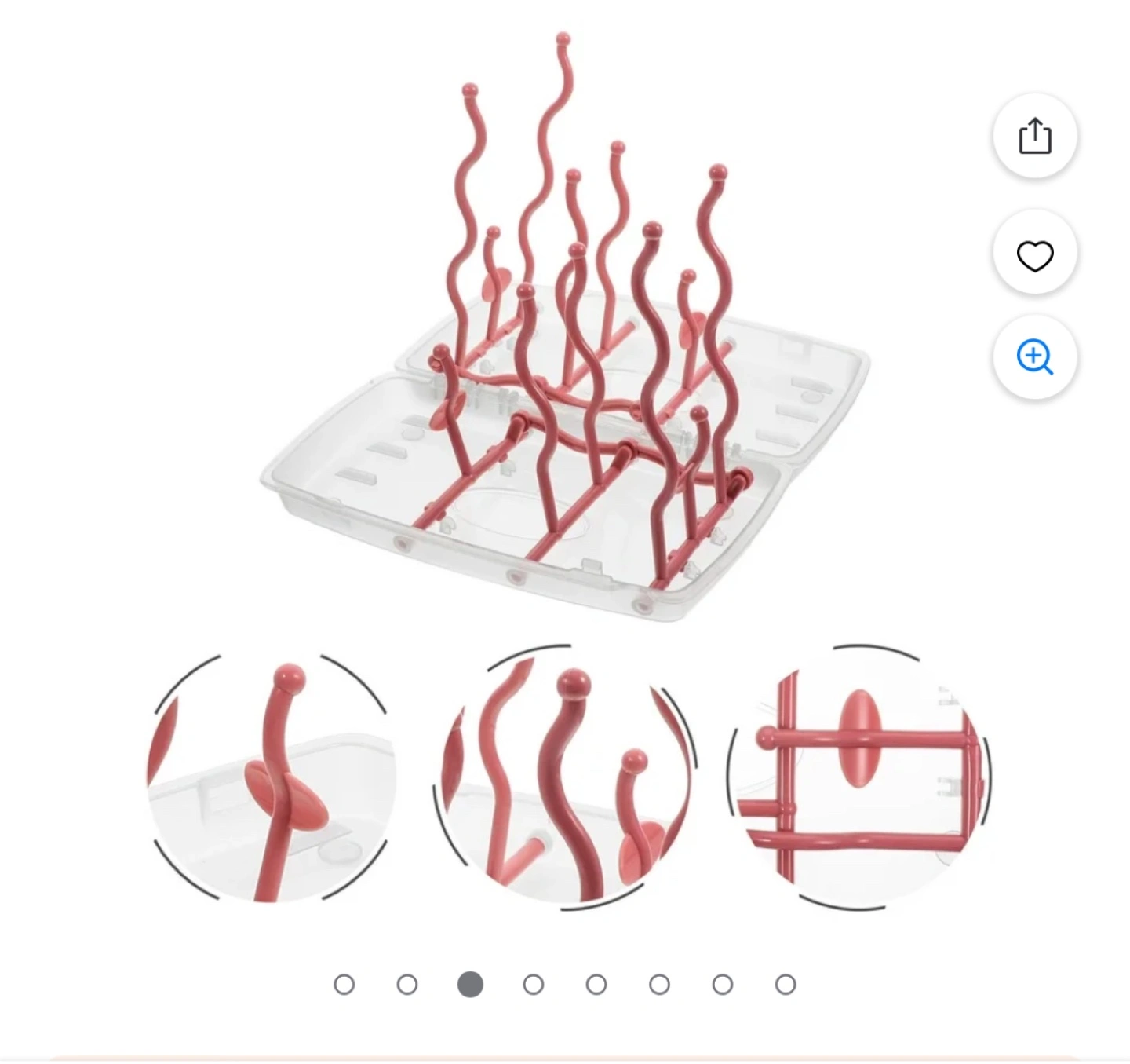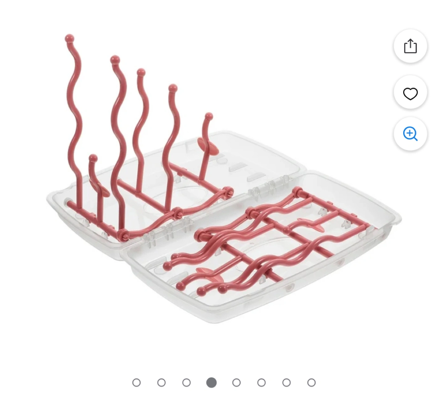 Portable bottle drying rack. Holds multiple bottles and cups. Disassembles easily for cleaning. Durable plastic construction. Compact design, great for travel.