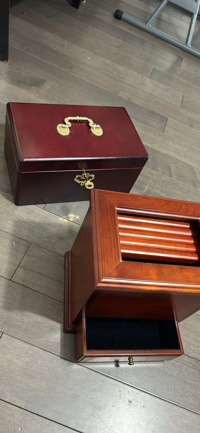 181Update: only the light brown one is available. The other one is SOLD. Take it for $15. ——- Set of two wooden boxes. $20 each. One rectangular box with a hinged lid and gold-coloured hardware. Second box is taller and more square with a pull-out drawer and slatted compartment. Both boxes appear to be made of dark wood. One on them comes with mirror inside. And jewelry storage plate