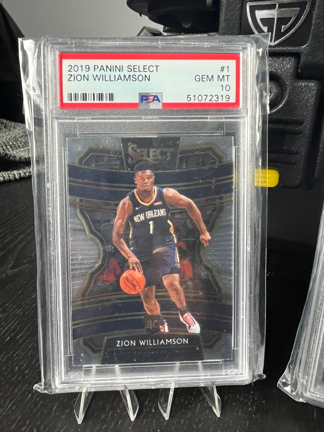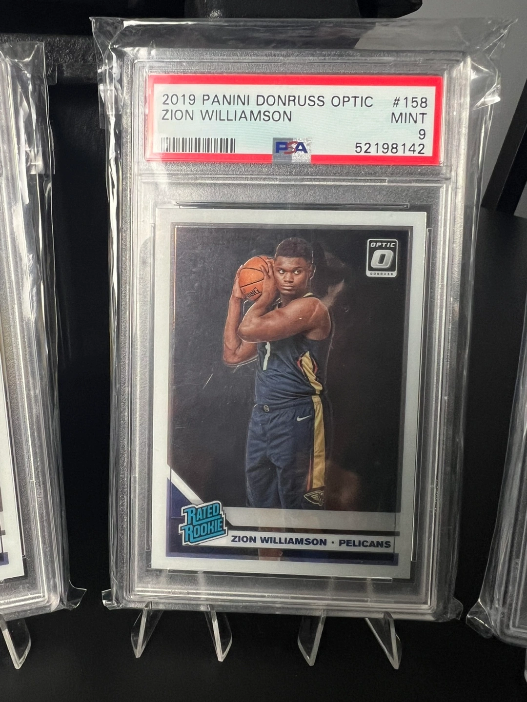 Lot of five Zion Williamson rookie cards. All graded by PSA. Includes Panini Prizm, Donruss Optic, Hoops, and Select.