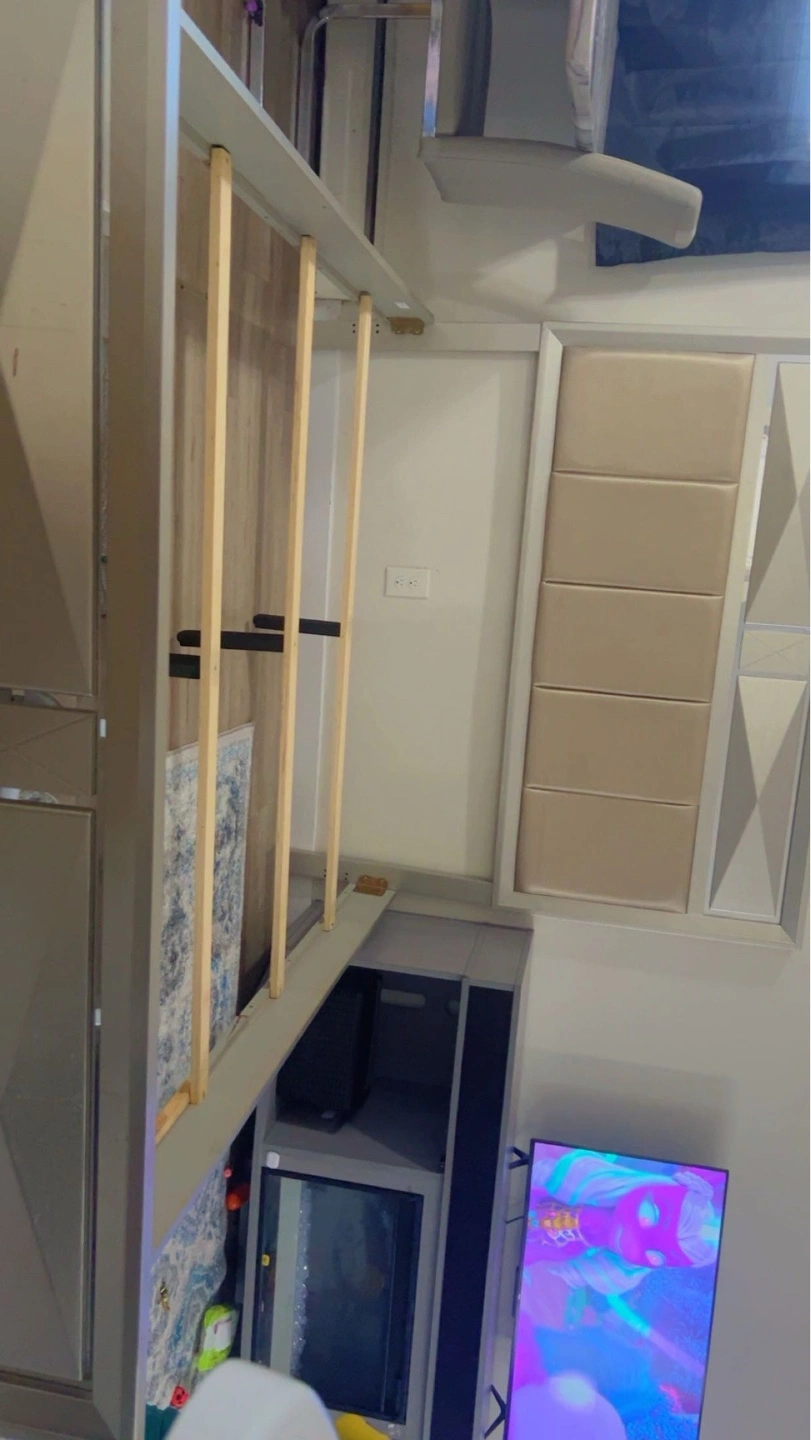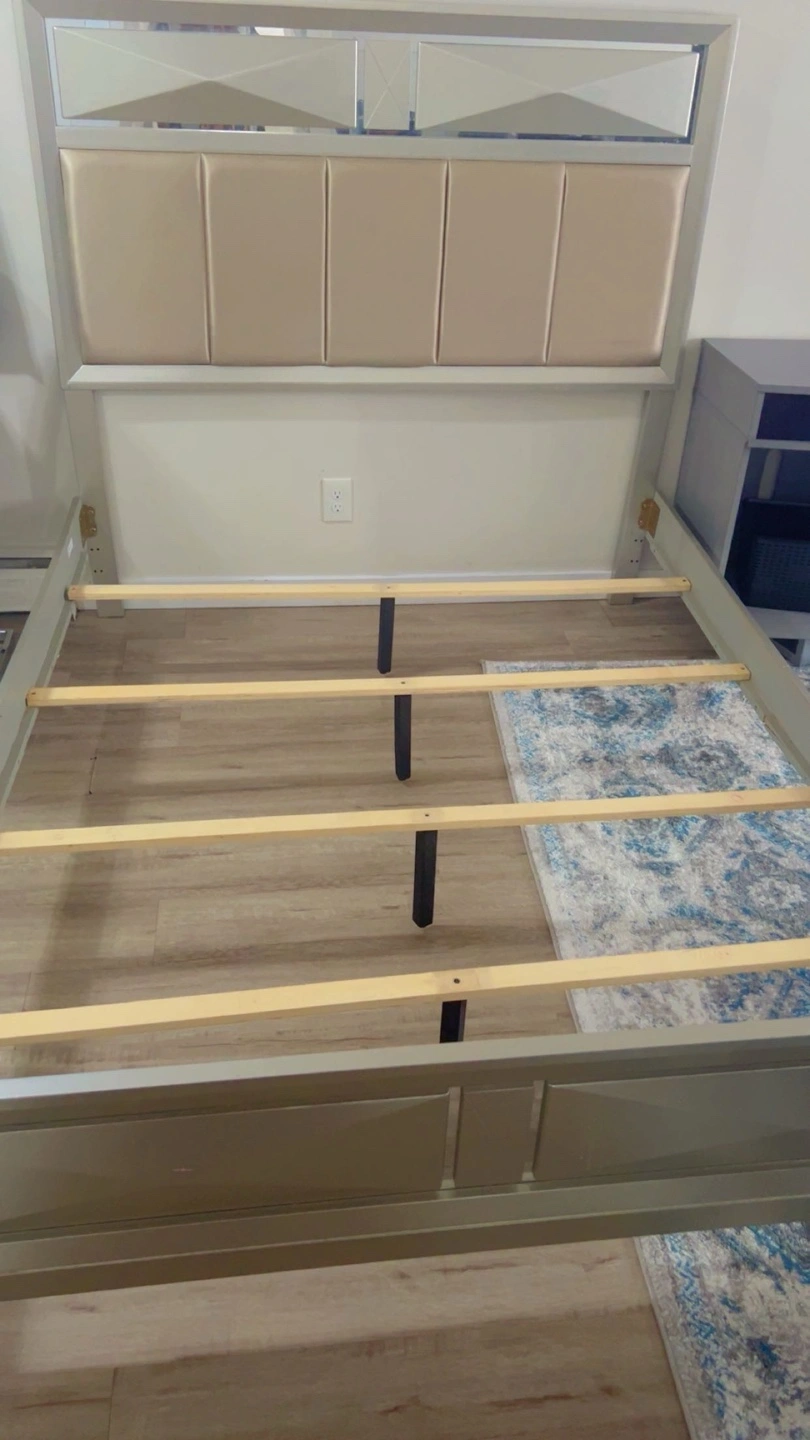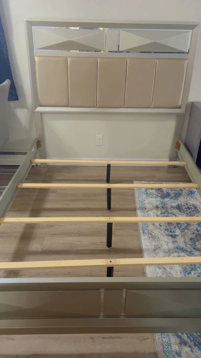 Elegant queen size bed frame. Features a mirrored and upholstered headboard. Light grey colour. Includes wooden slats for mattress support. Assembled.