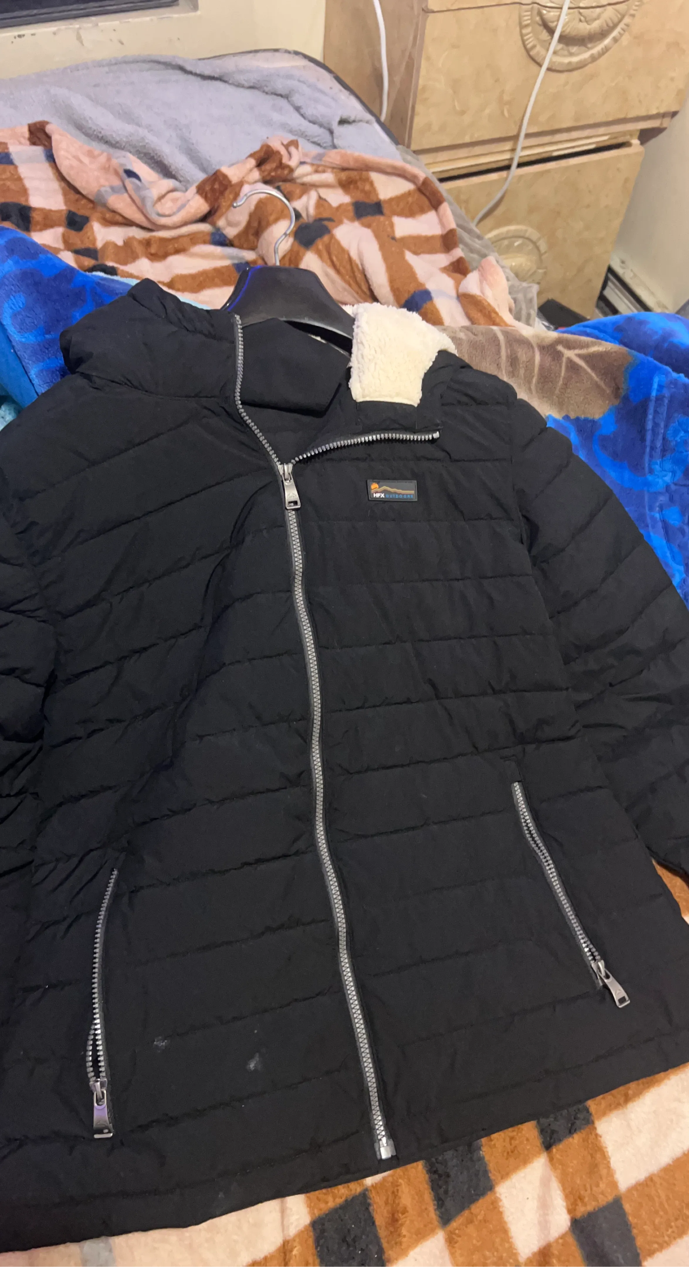 Black puffer jacket with a fleece-lined collar. Features full zip closure and zippered side pockets. Quilted design for warmth. Great for outdoor wear!