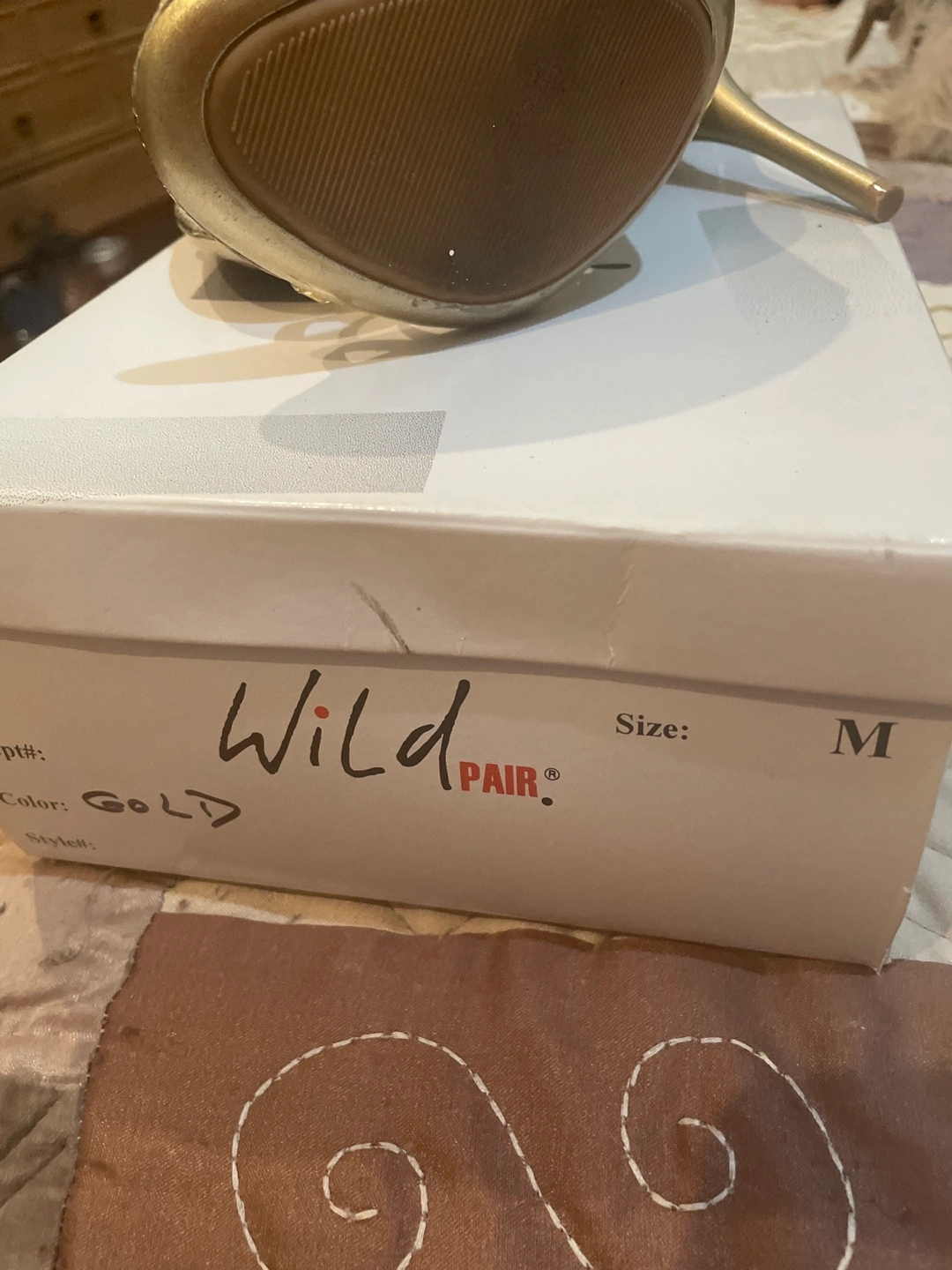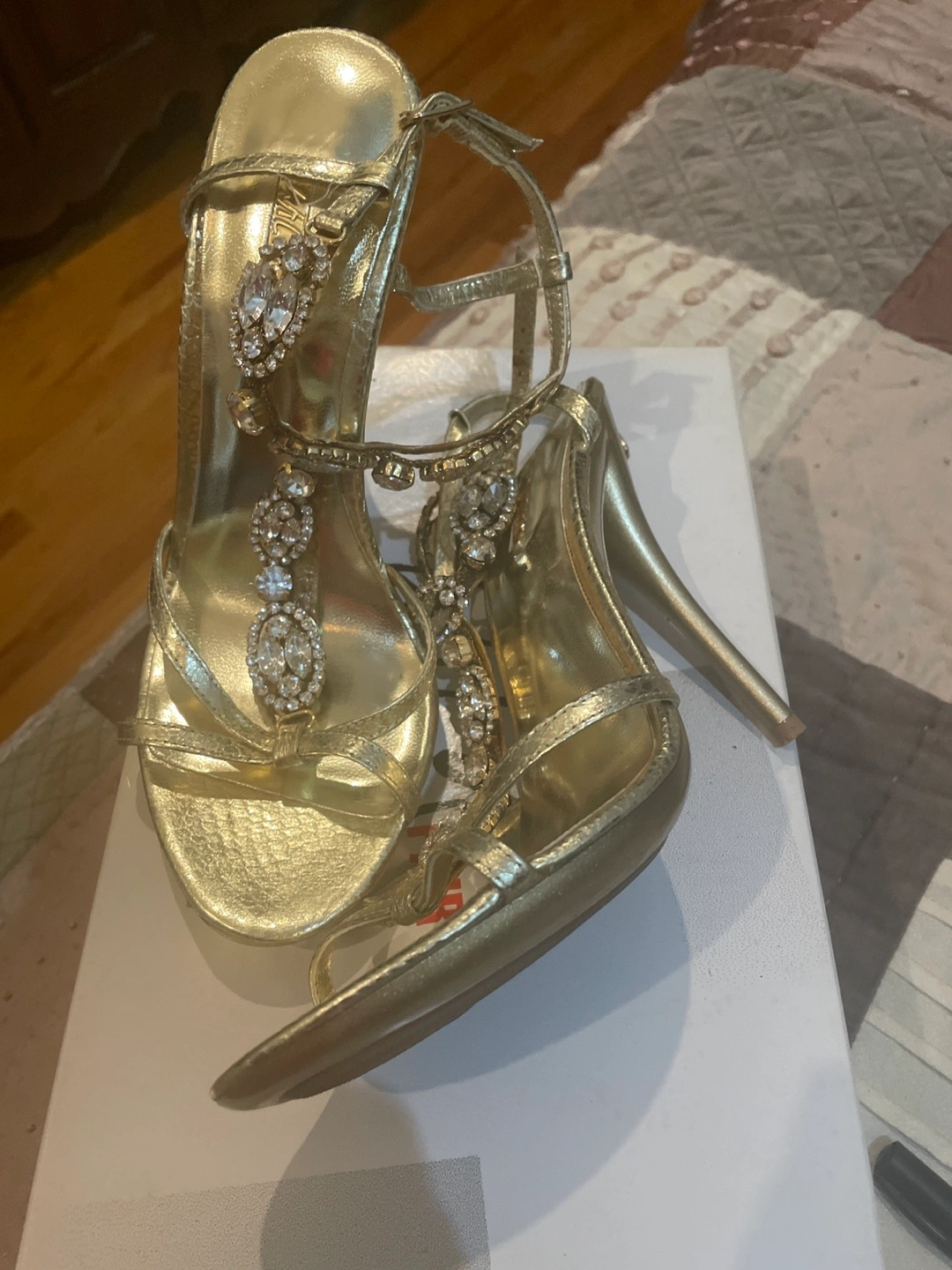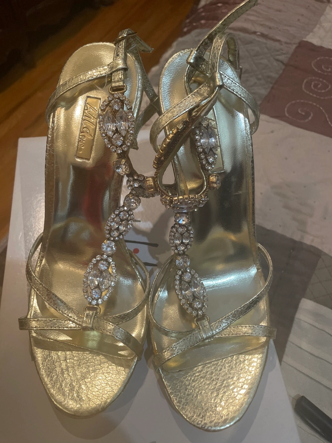 Gold strappy heels. Rhinestone embellishments. High heels. Size 7 M. Worn once. Bought new $74.99