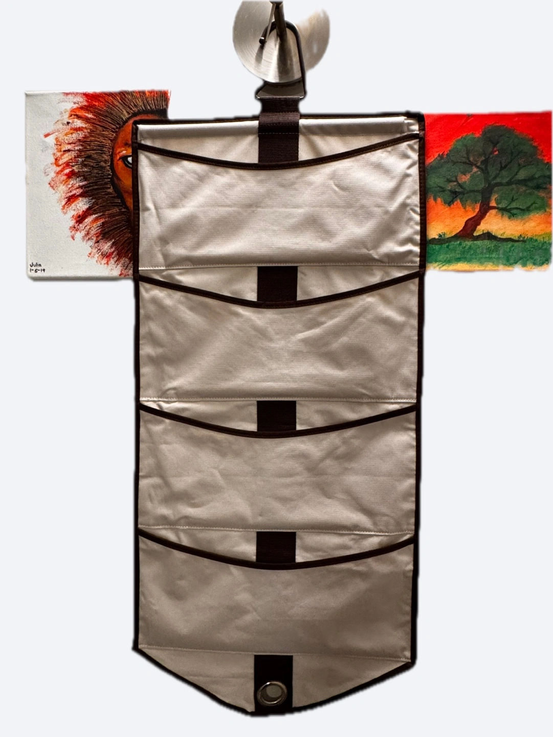 Hanging organiser, beige fabric, four pockets(each side), brown trim, metal hook. Great for storage.