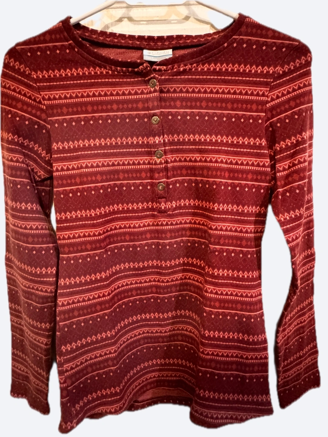 Women's long sleeve henley top. Burgundy colour with pink geometric pattern. Button placket. Soft material. Slightly used.
