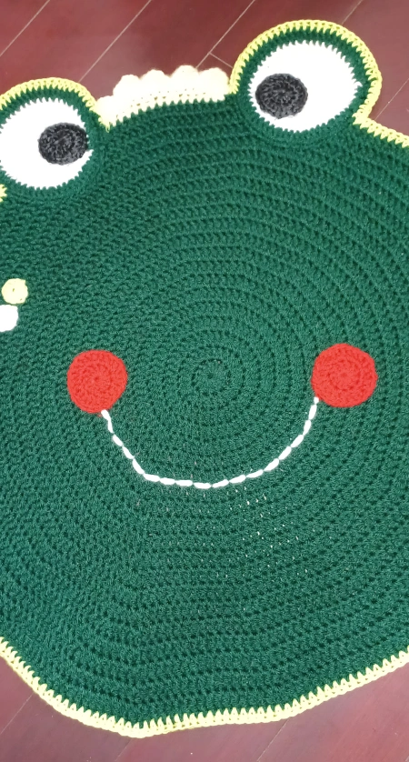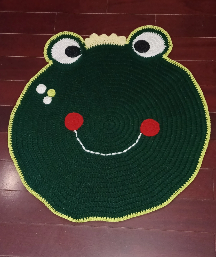Just finished adorable handmade crochet rug. Features a frog design. Green with yellow and red accents. Perfect for a child's room. Dimension approximately 23"