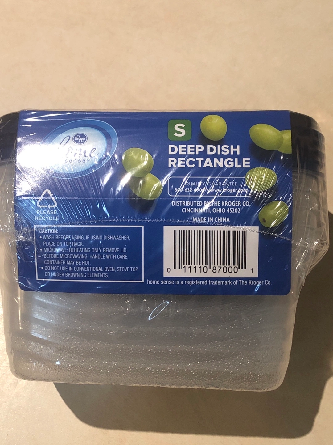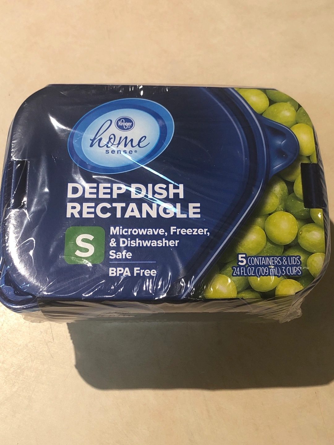 Five BPA free plastic food storage containers with lids. Microwave and dishwasher safe. Deep dish rectangle shape. Small size.