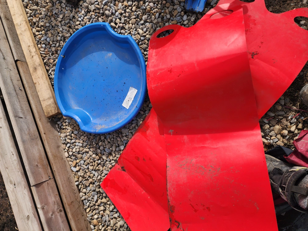 83Used blue plastic sled and a large, red plastic mat. Shows some wear from use. Great for kids.