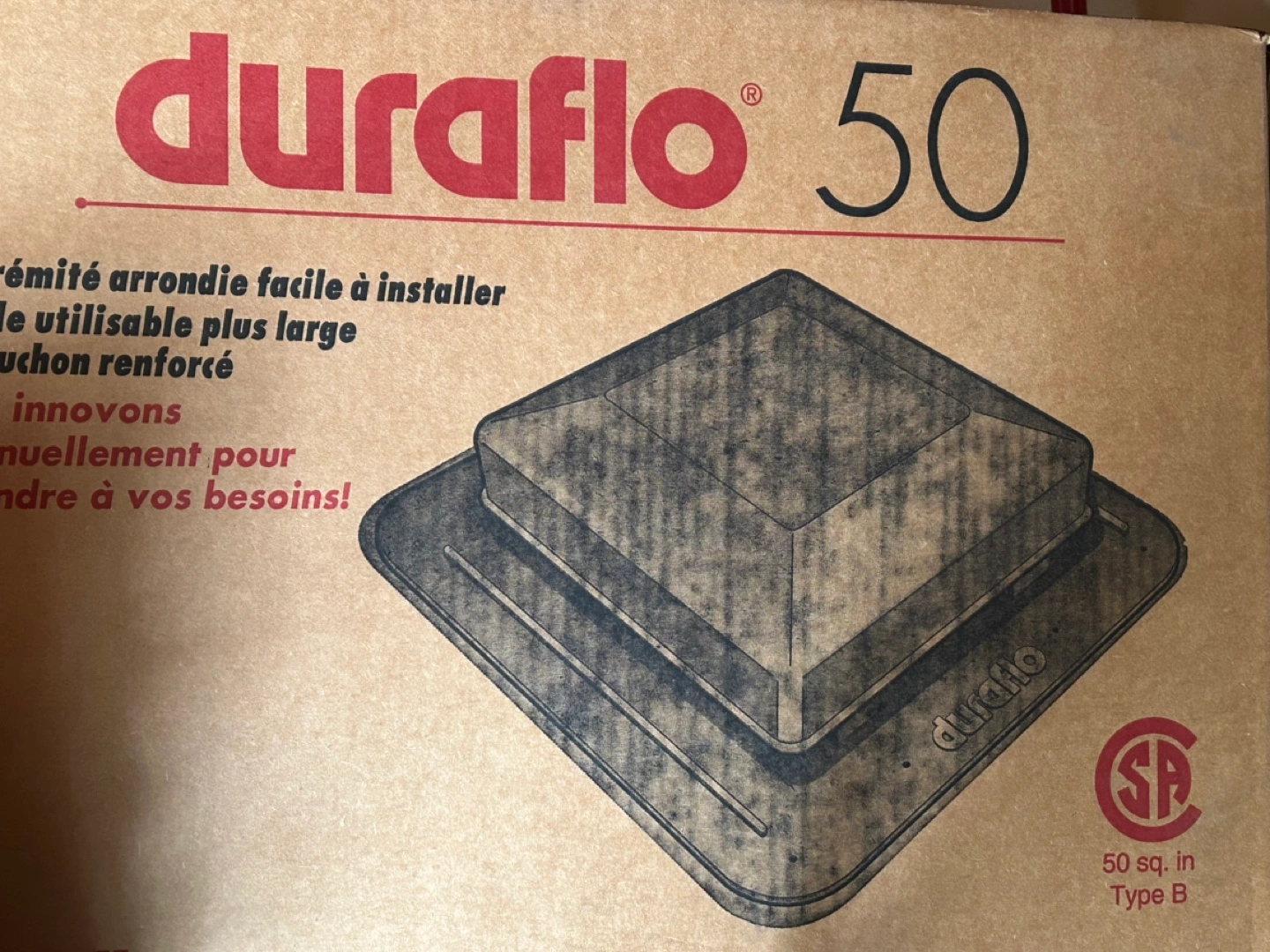 New Duraflo 50 square inch Type B vent. Easy to install. Large usable area. Reinforced cap. 10 each 7 vents available