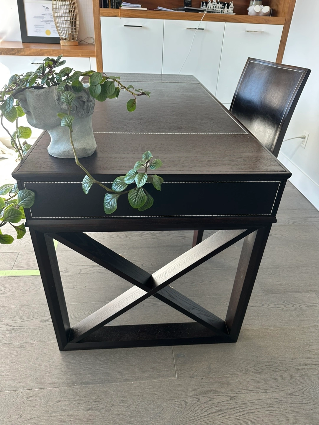 Stylish dark brown desk with leather top. Features 2 drawers and X-shaped legs. Matching brown leather chair included. Contemporary design, perfect for home or office.
