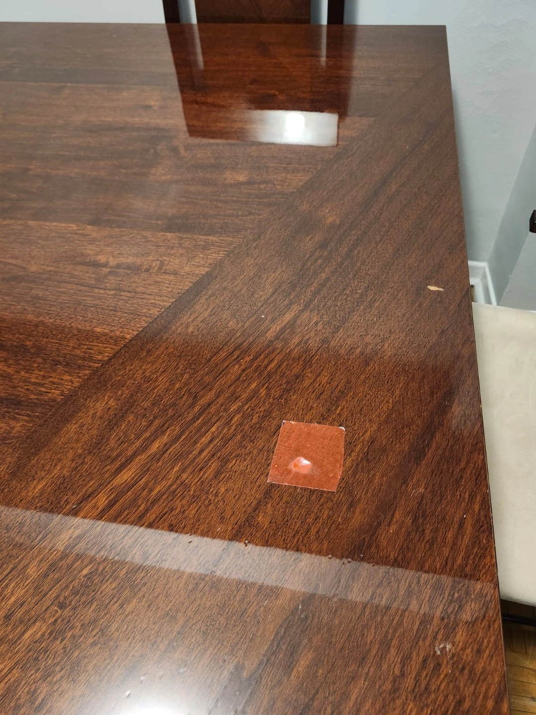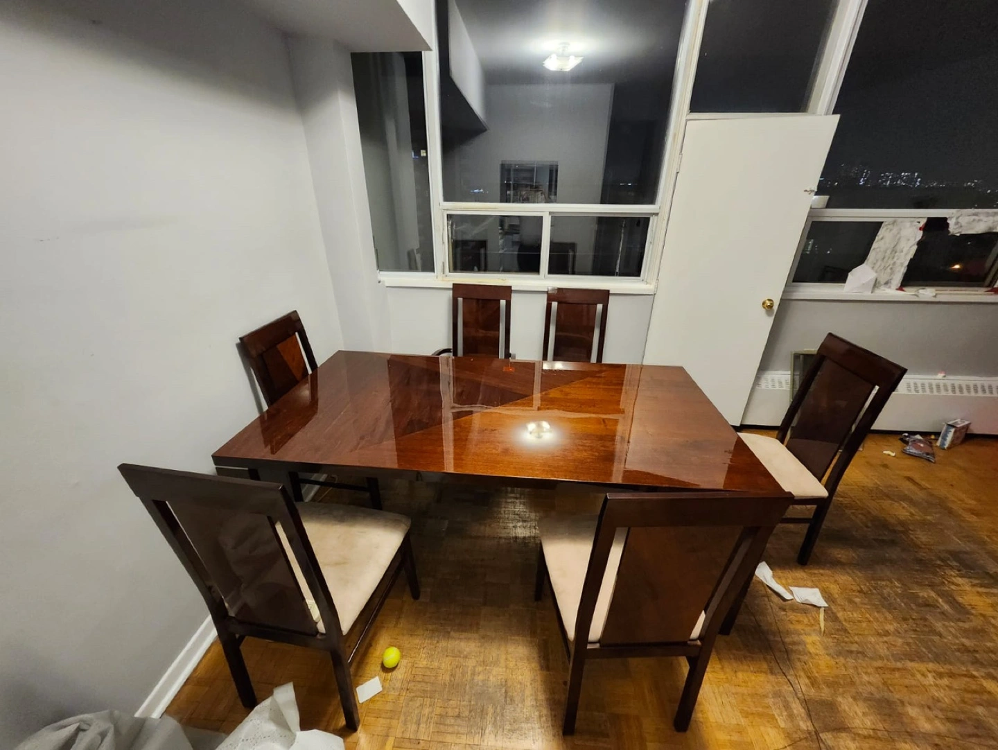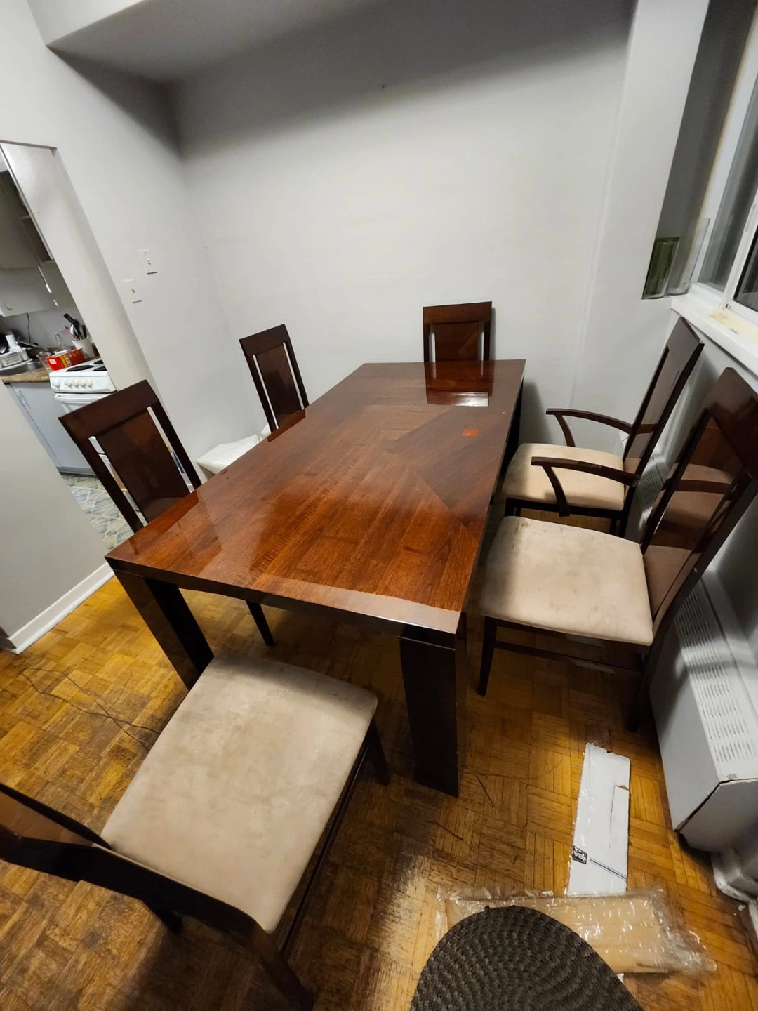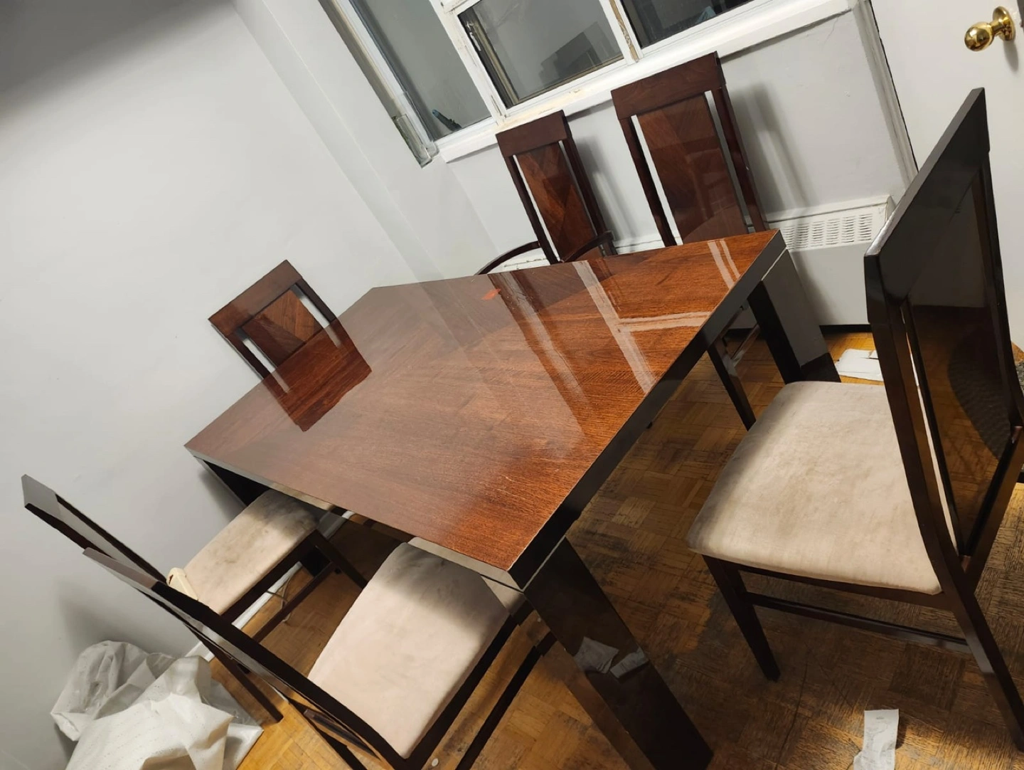 Six-chair dining set. Dark brown wood finish. Heavy !!! Original wood ! Beige fabric chairs. Minor wear. Chairs need a light wash but are perfectly fine
