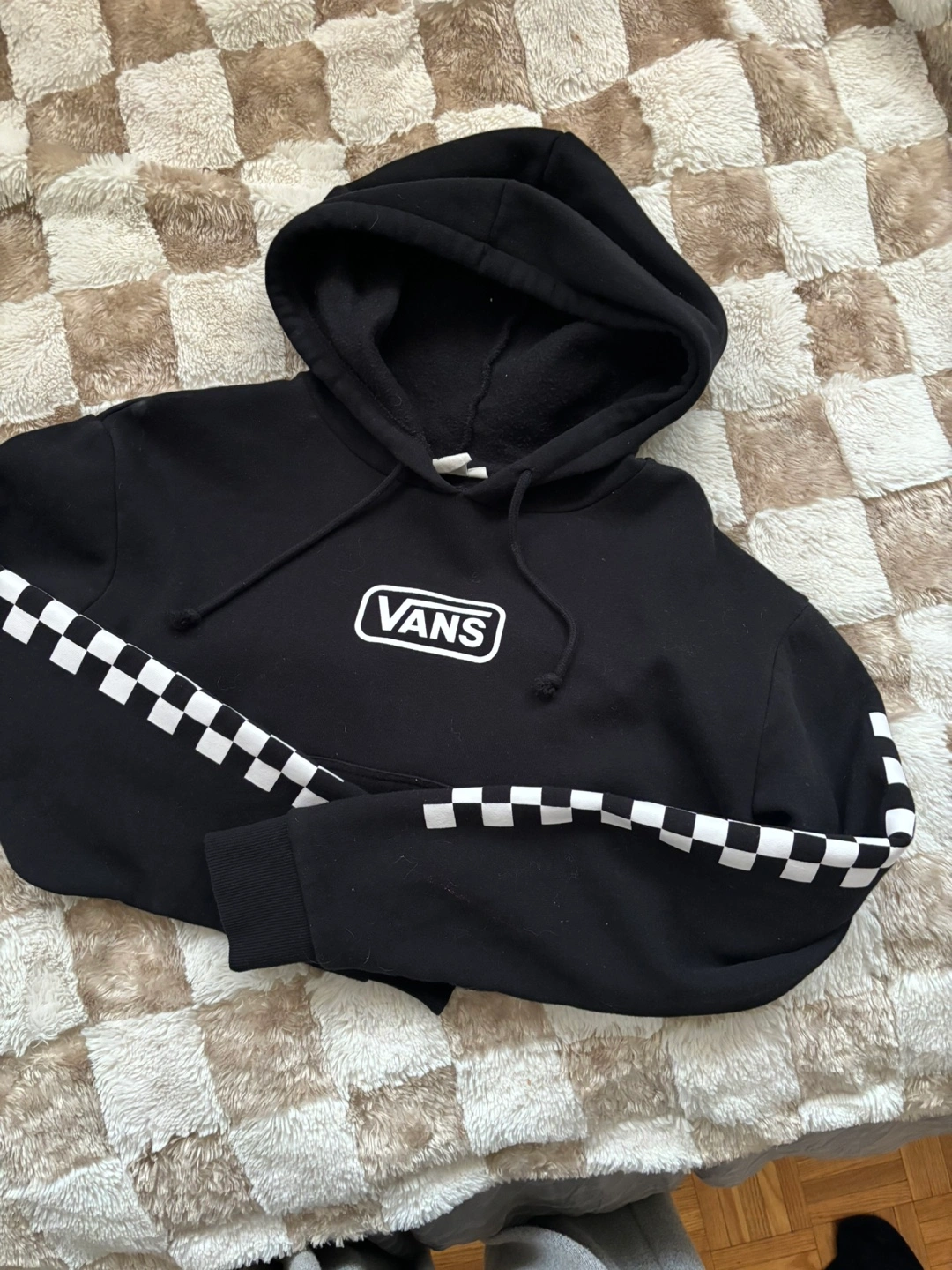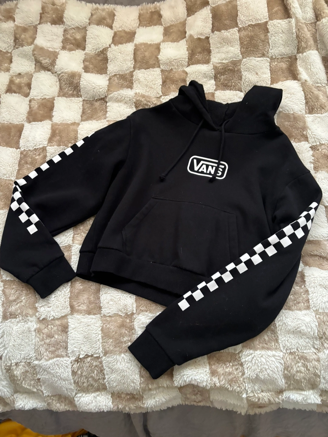 Black cropped hoodie. Features a Vans logo and checkered detailing on the sleeves. Long sleeves, drawstring hood, kangaroo pocket.