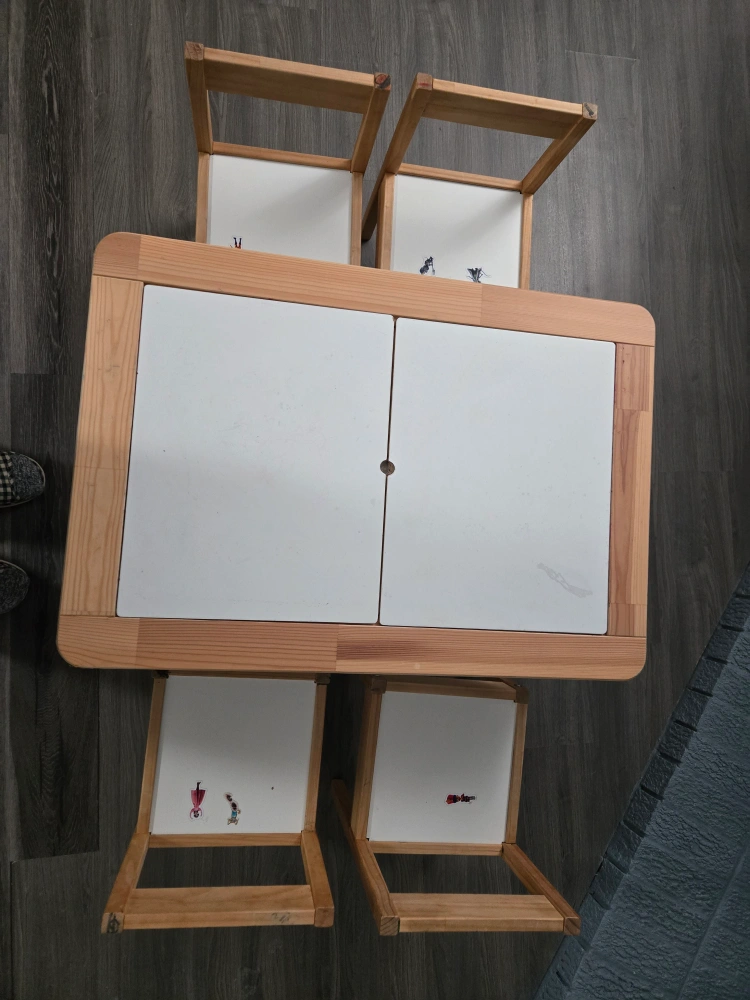 444Wooden children's table and four chairs. Table features two removable bins. Some minor wear and tear. Great for play or crafts.