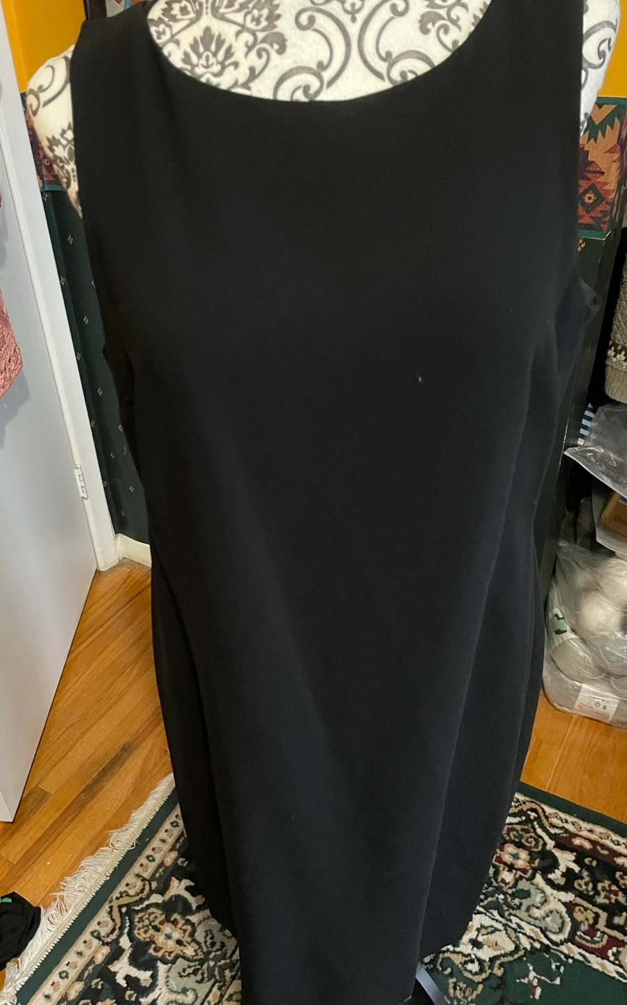 Elegant little black sleeveless dress. Simple, straight cut. Extra pics show dress worn with other jackets, one for evening the other for work or cocktails. Perfect for work or a special occasion.