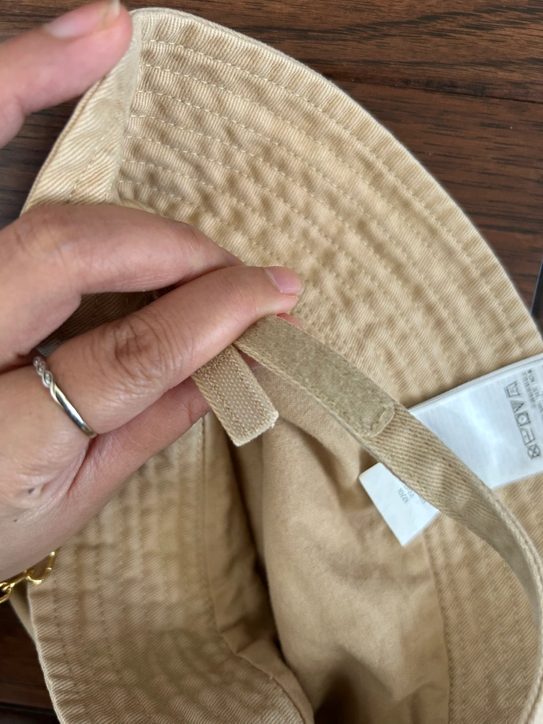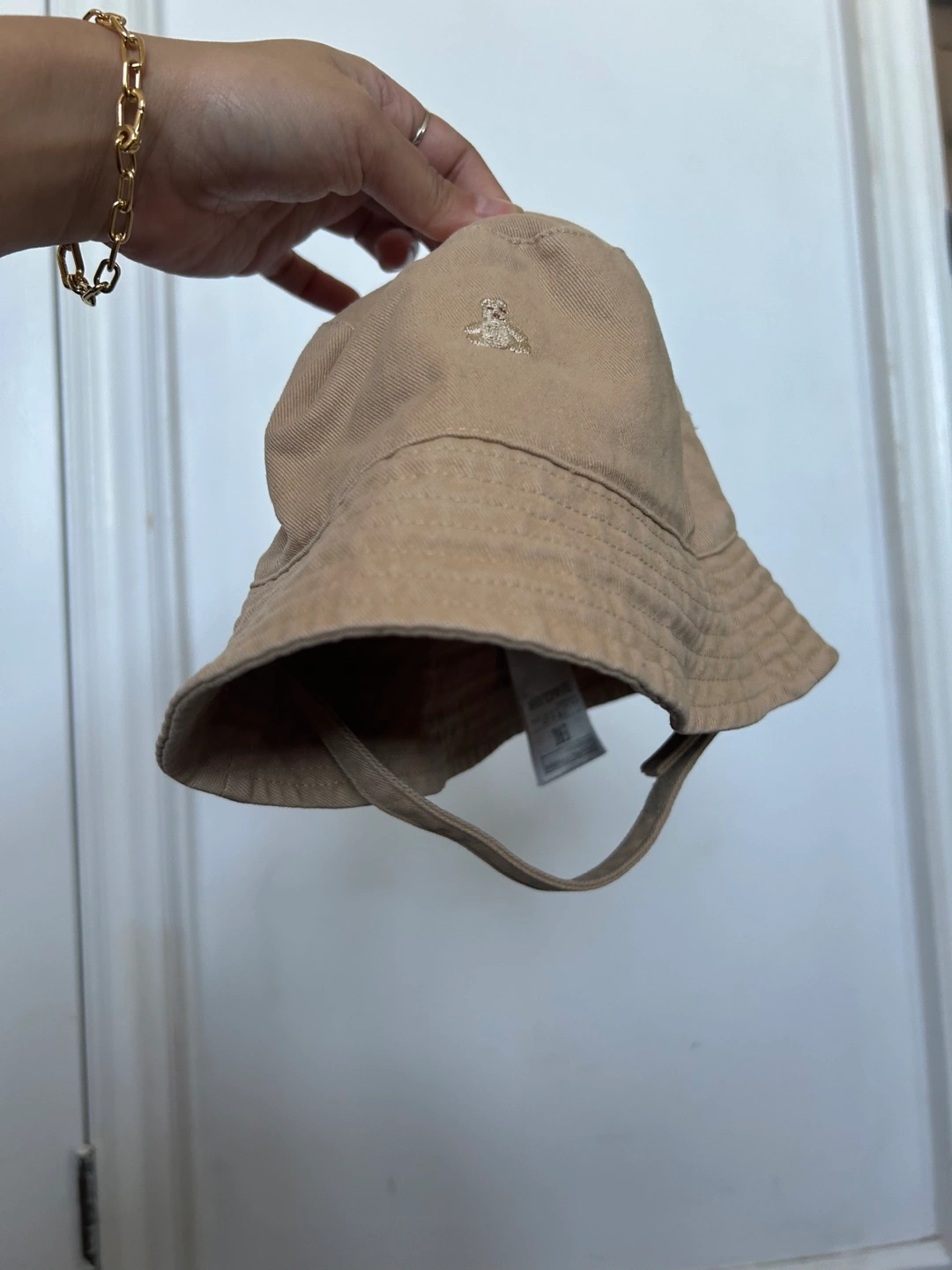Baby GAP adorable and classic beige bucket hat for a baby. Size 6-12 months. Features a cute embroidered bear and a velcro chin strap to stay in place. Cotton material.