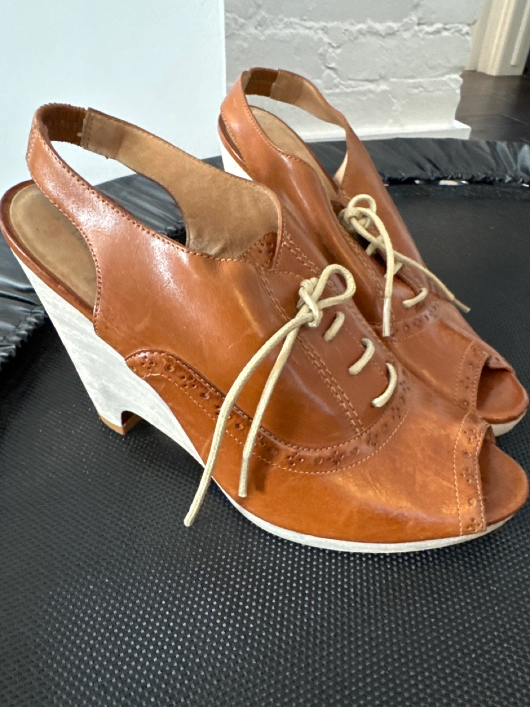 90Vintage brown leather peep-toe wedge sandals. Features a slingback design and lace-up detail. Wedge heel. Pre-owned.