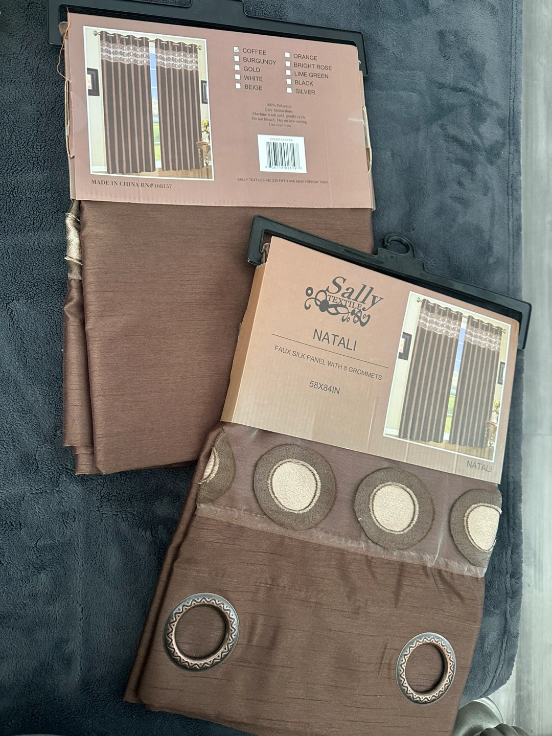 Brand new, still in package. Faux silk panels. 8 grommets. 58x84 inches. Brown colour. Machine washable. Paid $49.99 ea Selling for only $25 ea or both for $45 (cash only please) Pick up in Kitchener (some days, I can also meet up in Cambridge, Guelph or Waterloo) Smoke and pet free home Check out my other ads for more great items for sale!!