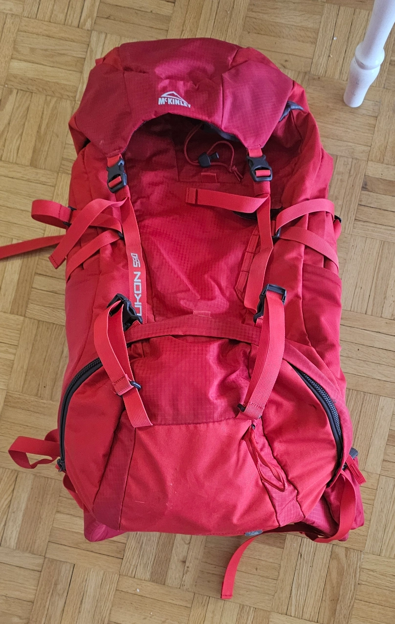 Red McKinley Yukon 55+10 litre backpack. Multiple compartments and adjustable straps. Great for hiking and backpacking. Includes spot for hydration bladder, built in waterproof rain fly. Only used once. Near perfect condition.